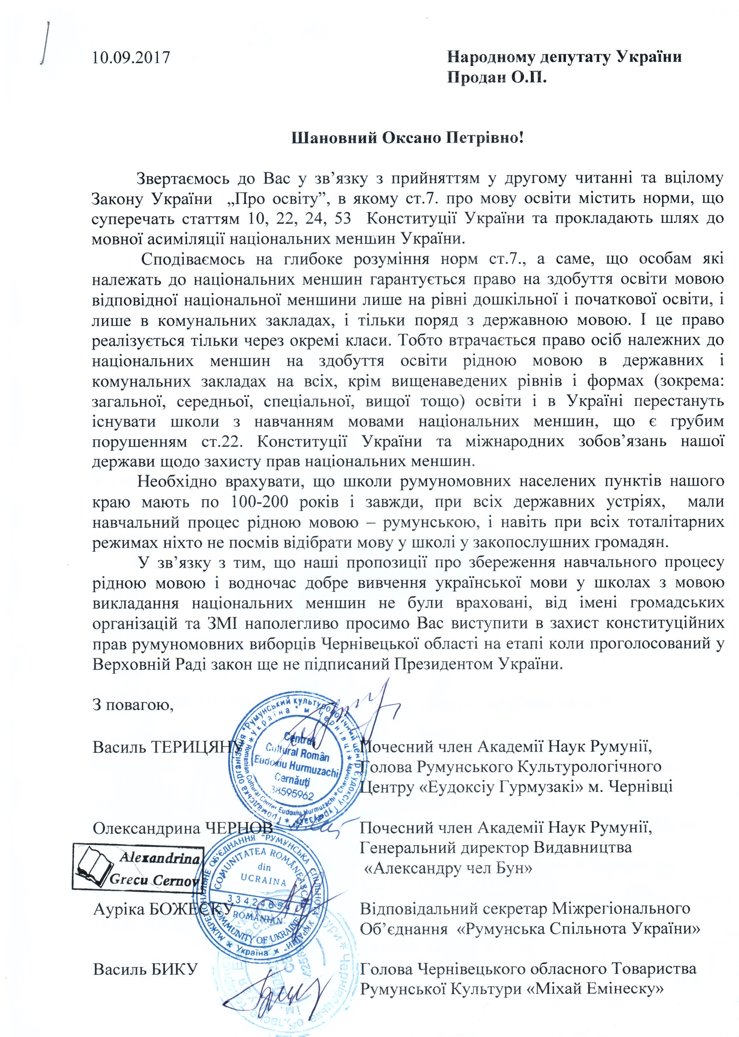 23Жов Коментування вимкнено Лист громадських організацій Чернівецької області, які опікуються питаннями захисту прав національних менш, щодо прийняття Закону України “Про освіту”