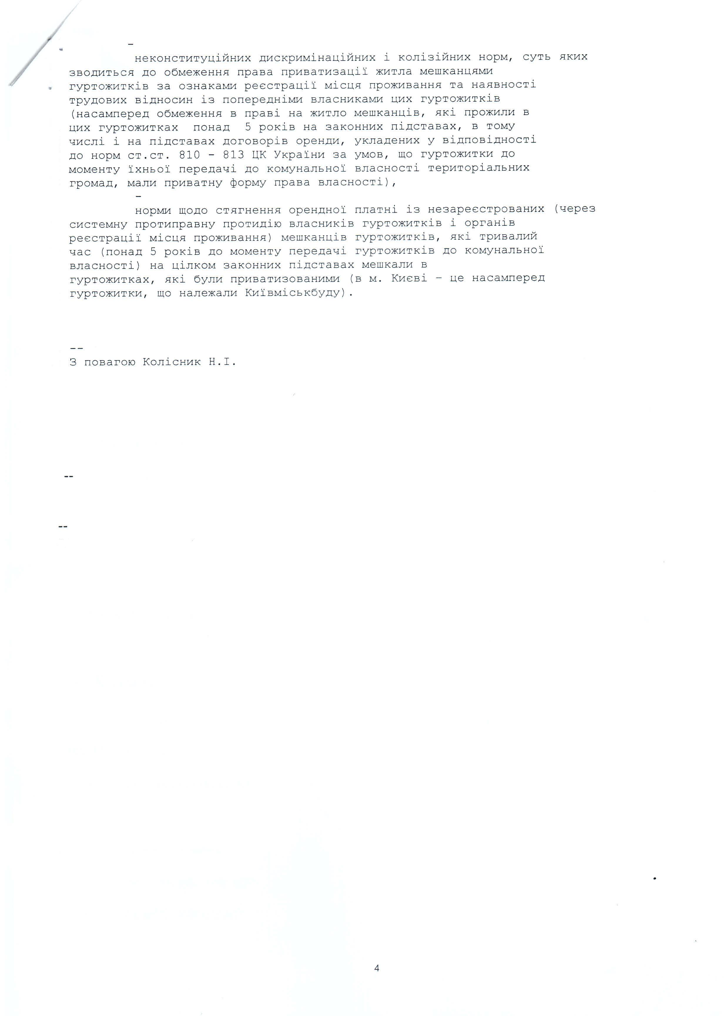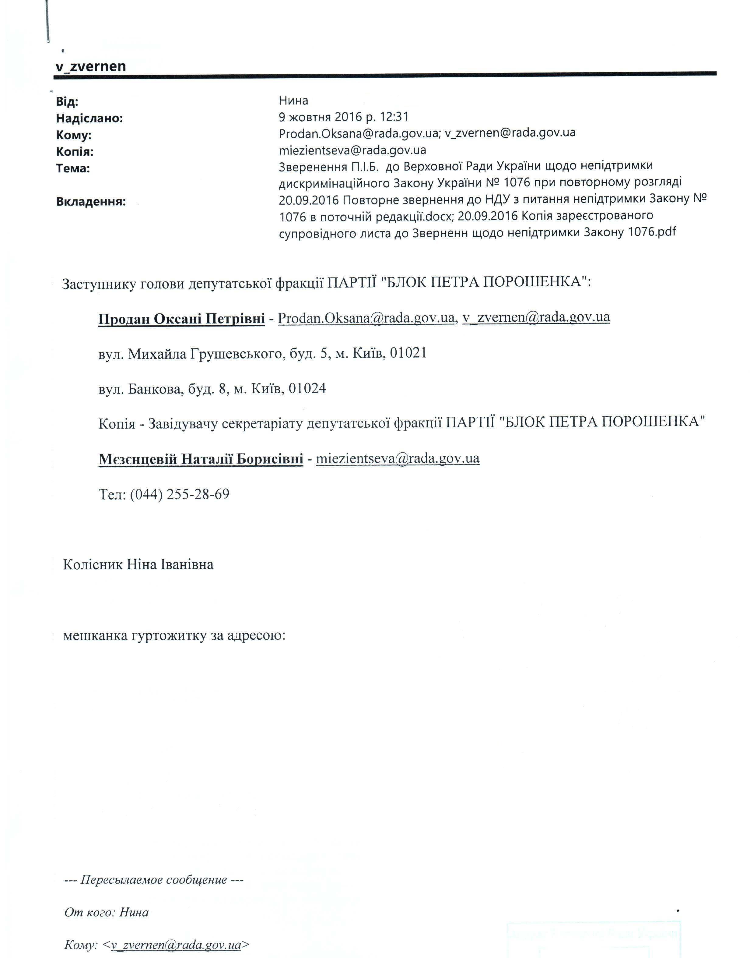 Лист Колісник Н.І. щодо непідтримки при повторному розгляді проекту Закону України “Про внесення змін до деяких законодавчих актів України (щодо уточнення сфери застосування та удосконалення окремих положень передачі гуртожитків у власність територіальних громад і забезпечення реалізації житлових прав законними мешканцями гуртожитків)”, реєстр. №1076
