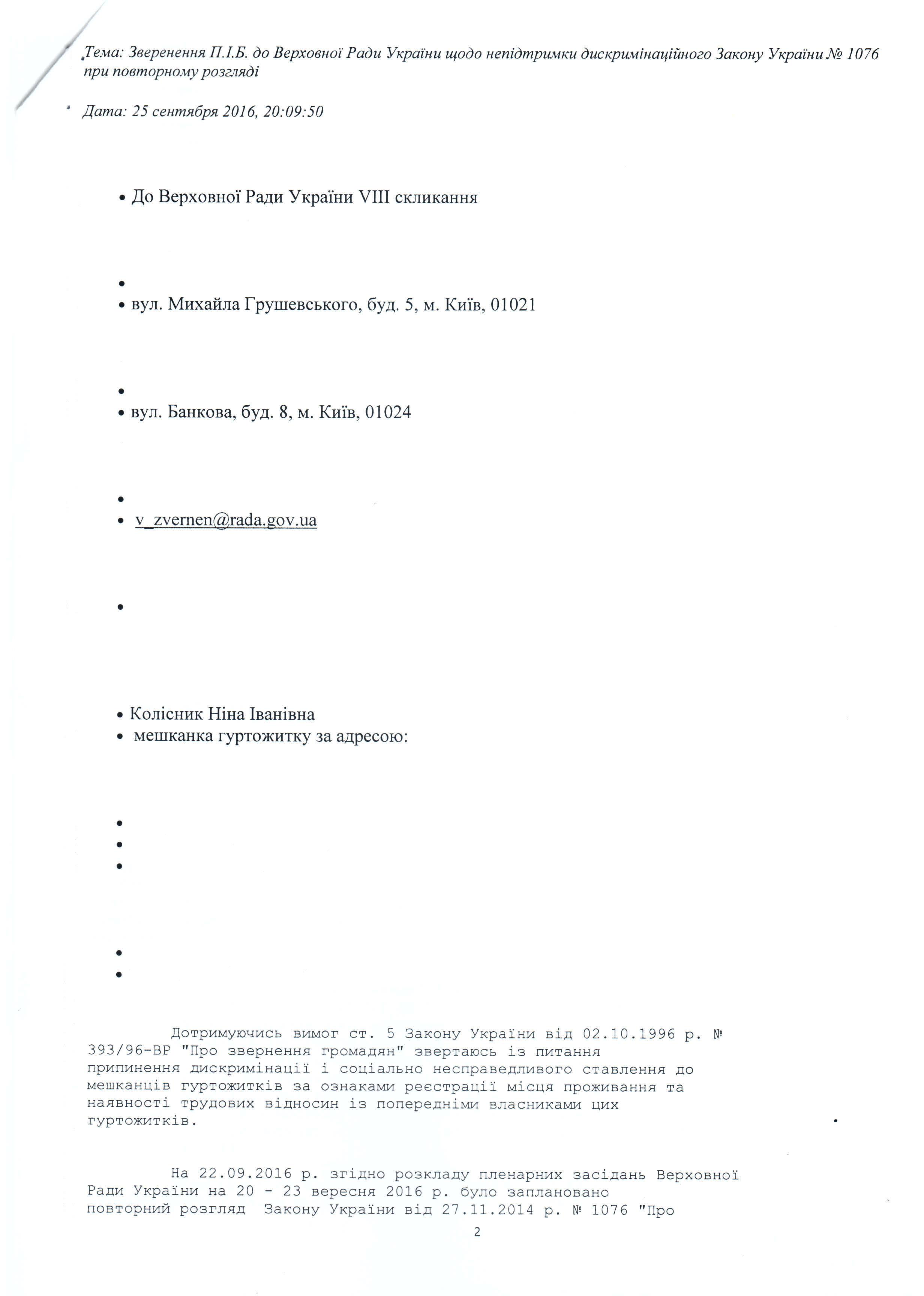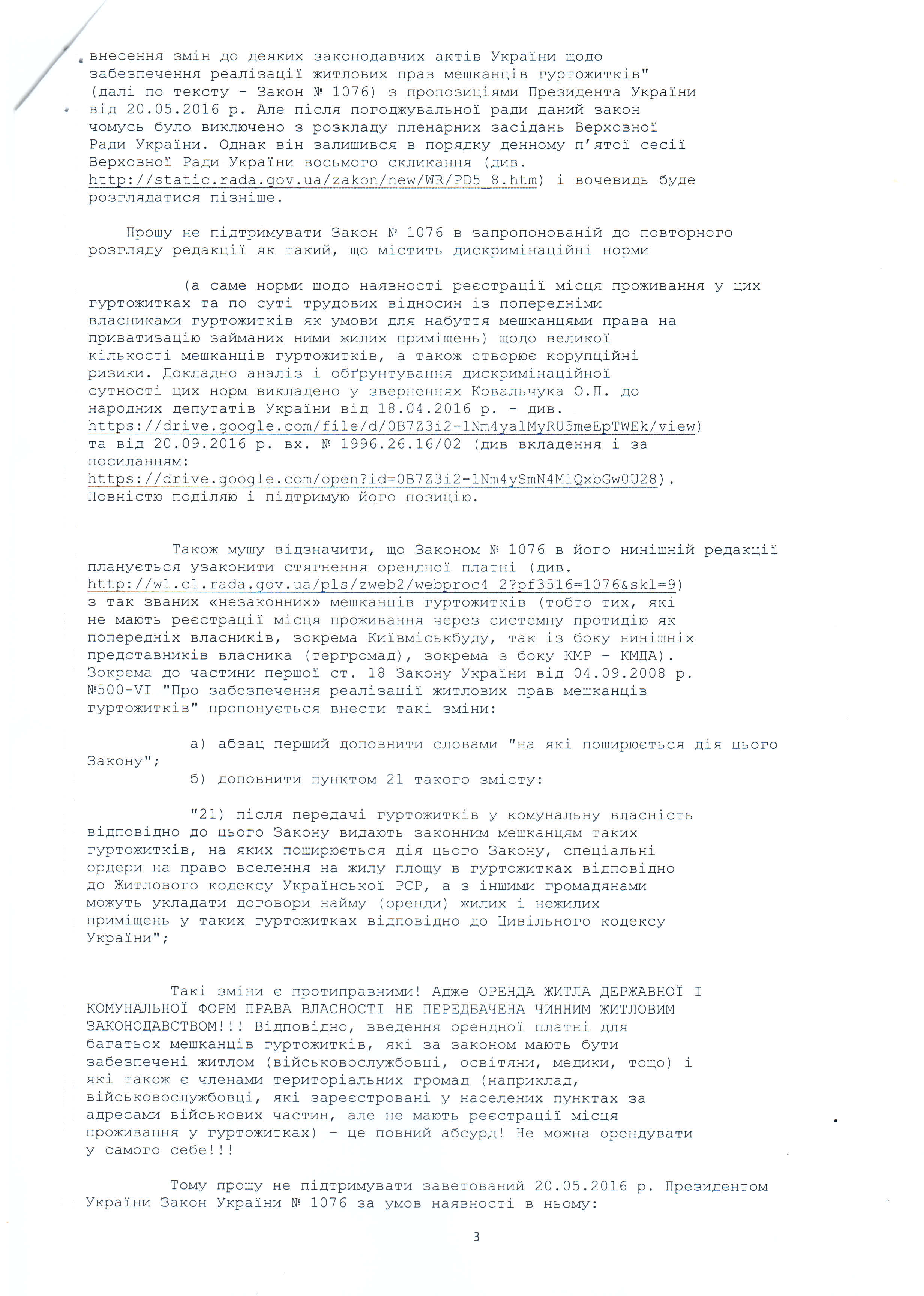 Головна > Верховна Рада України > Вхідна документація > Лист Колісник Н.І. щодо непідтримки при повторному розгляді проекту Закону України “Про внесення змін до деяких законодавчих актів України (щодо уточнення сфери застосування та удосконалення окремих положень передачі гуртожитків у власність територіальних громад і забезпечення реалізації житлових прав законними мешканцями гуртожитків)”, реєстр. №1076