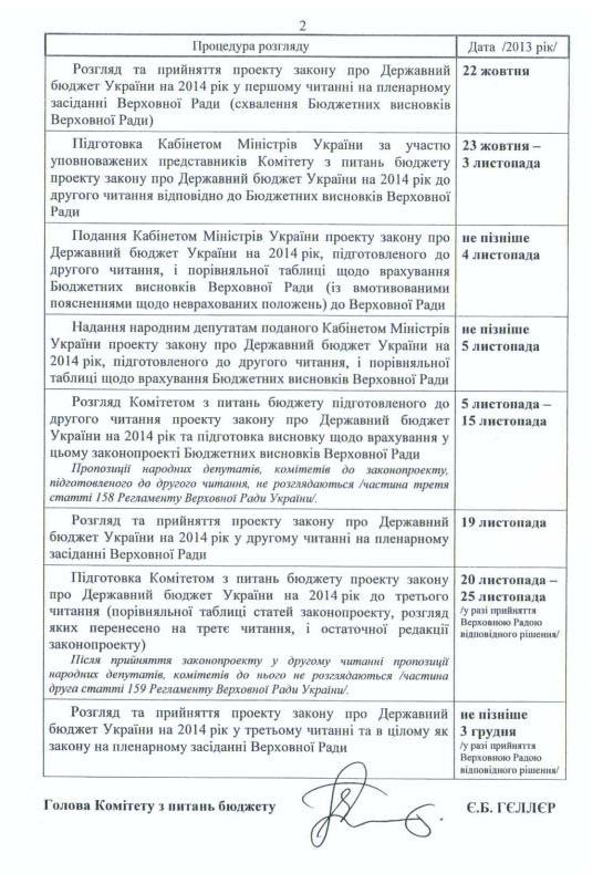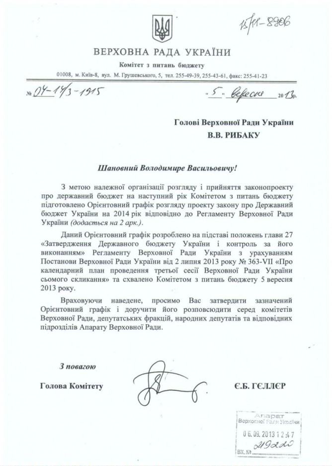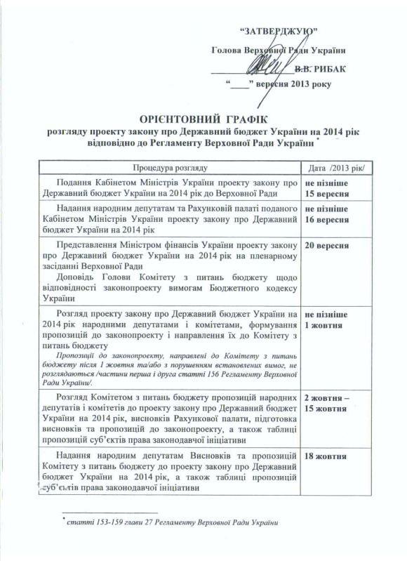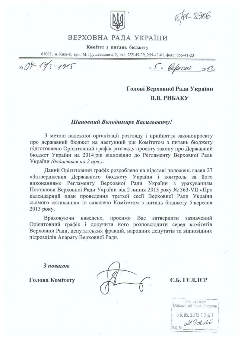 Лист Комітету Верховної Ради України з питань бюджету щодо підготовлено Орієнтовного графіку розгляду проекту закону про Державний бюджет України на 2014 рік