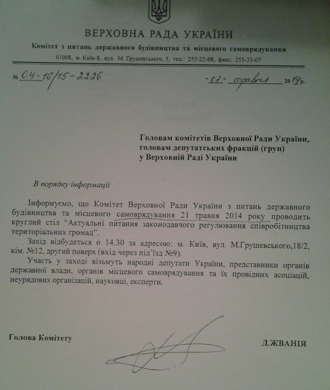 Лист Комітету Верховної Ради України з питань державного будівництва та місцевого самоврядування щодо проведення круглого столу “Актуальні питання законодавчого регулювання співробітництва територіальних громад”