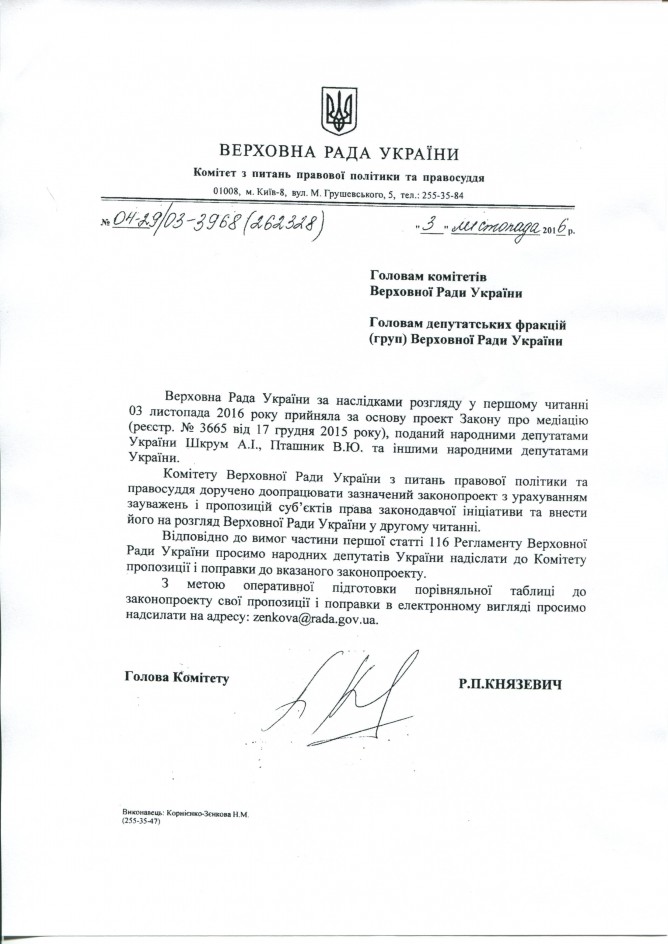 04Лис Коментування вимкнено Лист Комітету Верховної Ради України з питань правової політики та правосуддя щодо надання пропозицій до законопроекту “Про медіацію”, реєстр. №3665
