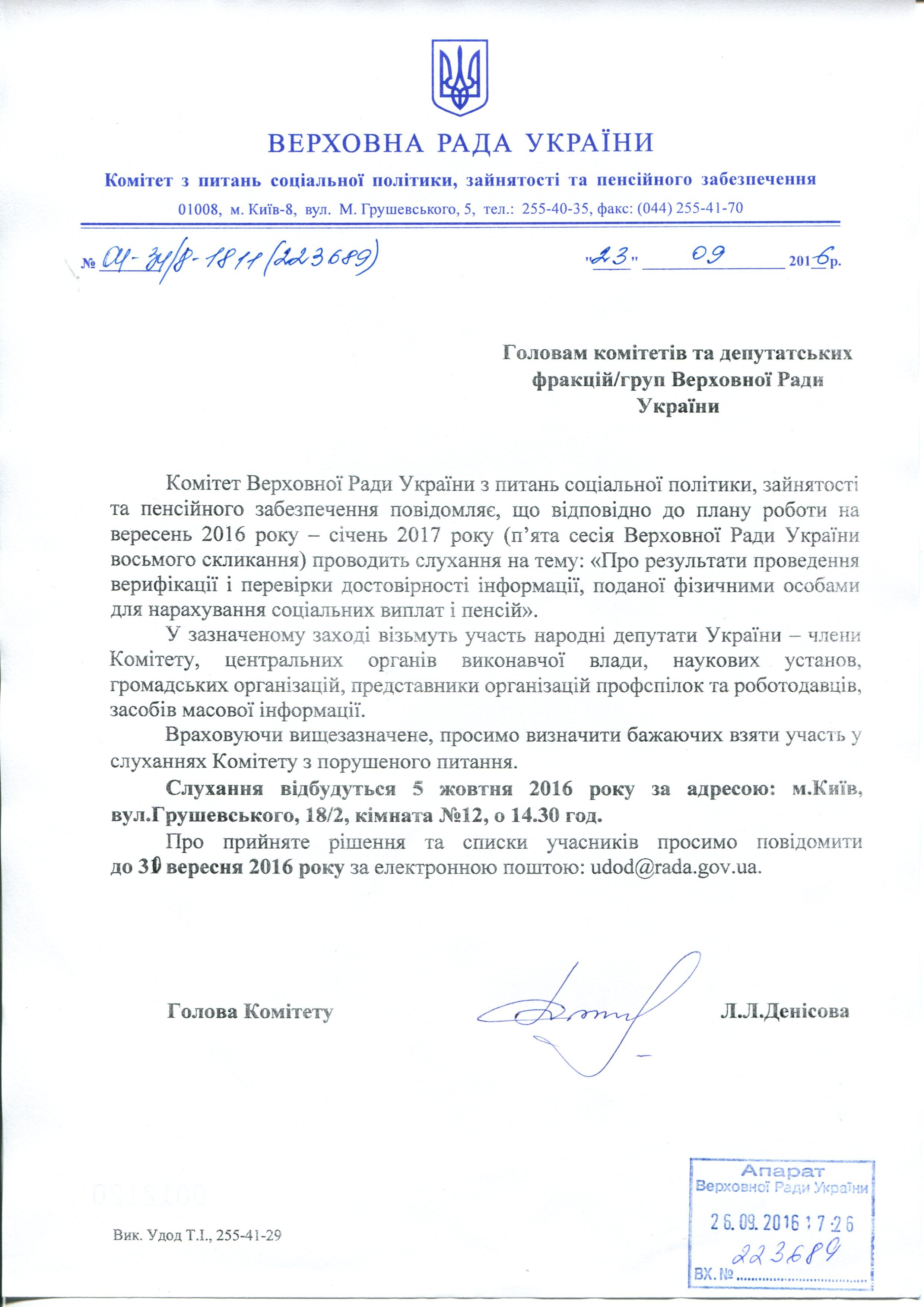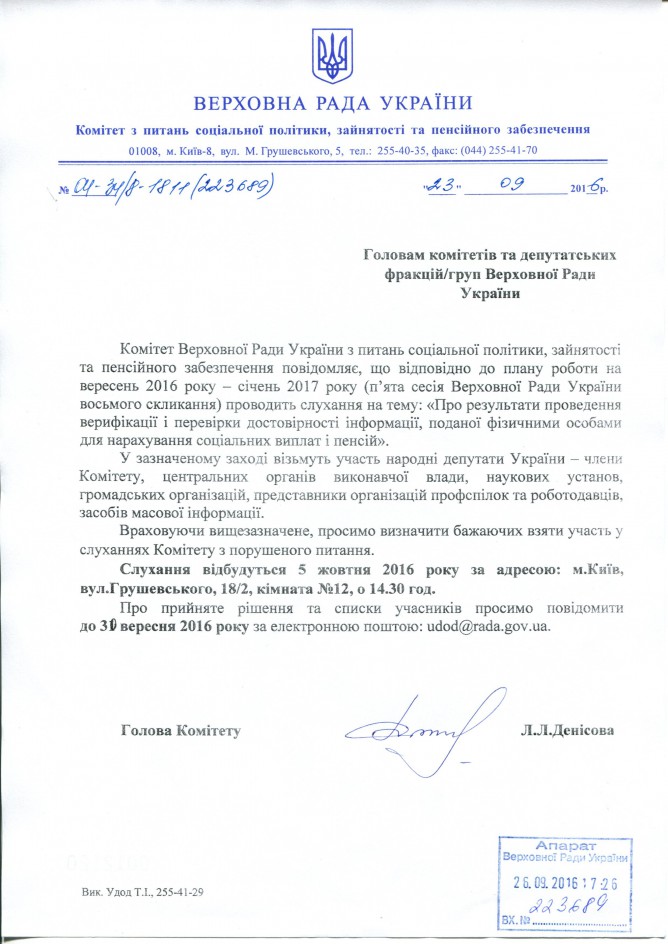 Вхідна документація > Лист Комітету Верховної Ради України з питань соціальної політики, зайнятості та пенсійного забезпечення щодо проведення Комітетських слухань на тему: “Результати проведення верифікації і перевірки достовірності інформації, поданої фізичними особами для нарахування соціальних виплат і пенсій”