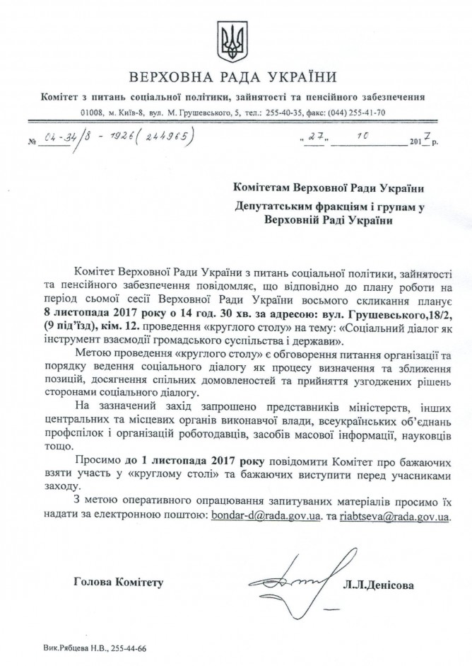 Вхідна документація > Лист Комітету Верховної Ради України з питань соціальної політики, зайнятості та пенсійного забезпечення щодо проведення круглого столу на тему: “Соціальний діалог як інструмент взаємодії громадянського суспільства і держави”, 8 листопада 2017 року