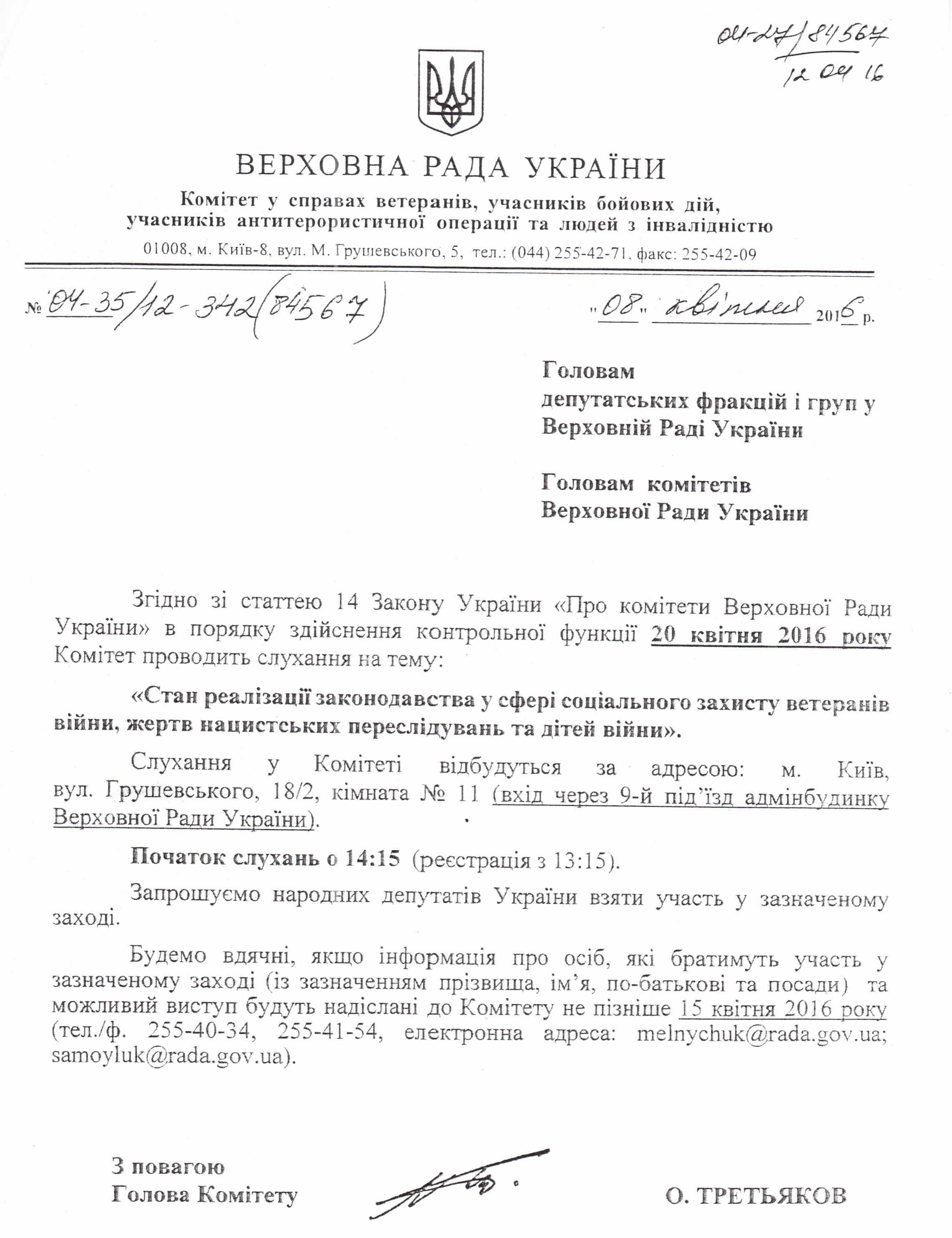 Вхідна документація > Лист Комітету ВРУ у справах ветеранів, учасників бойових дій, учасників АТО та людей з інвалідністю щодо проведення комітетських слухань на тему: “Стан реалізації законодавства у сфері соціального захисту ветеранів війни, жертв нацистських переслідувань та дітей війни”