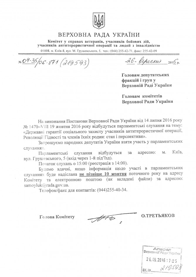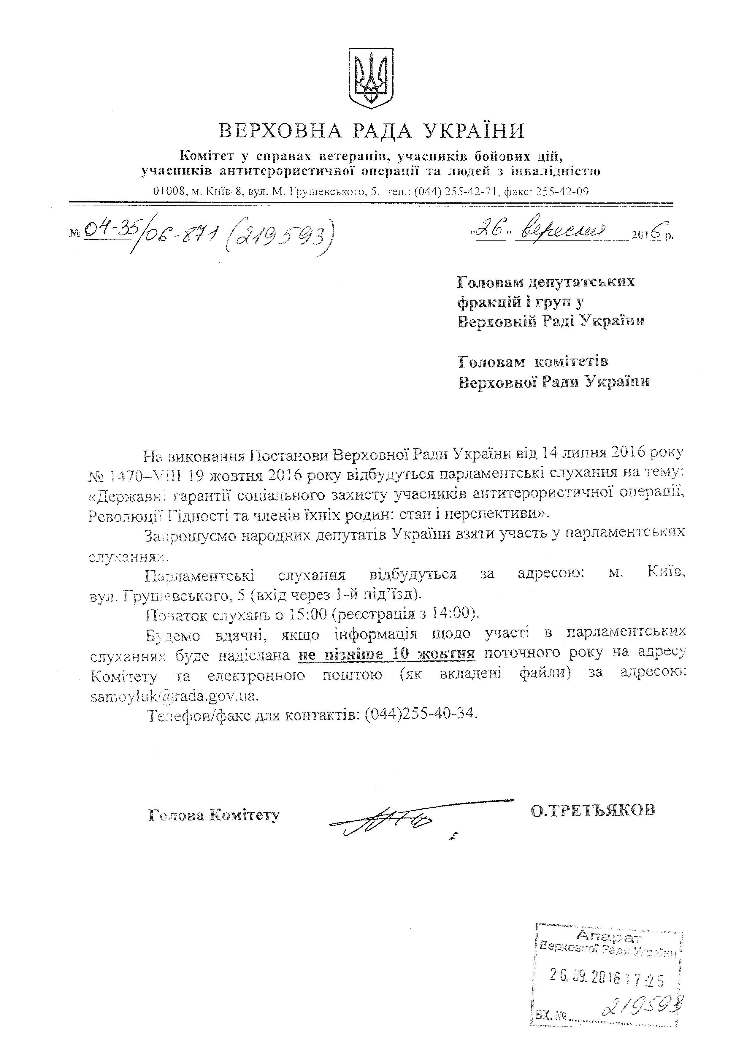 Вхідна документація > Лист Комітету ВРУ у справах ветеранів, учасників бойових дій, учасників АТО та людей з інвалідністю щодо проведення парламентських слухань на тему: “Державні гарантії соціального захисту учасників АТО, Революції Гідності та членів їхніх родин: стан і перспективи”