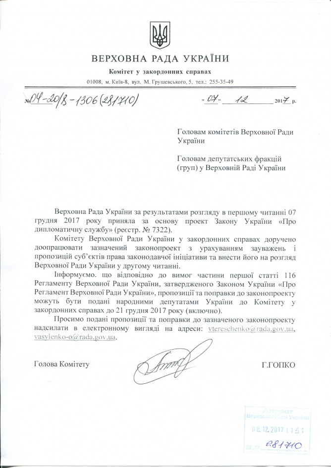 12Гру Коментування вимкнено Лист Комітету ВРУ у закордонних справах щодо подання поправок до проекту Закону України “Про дипломатичну службу”, реєстр. №7322