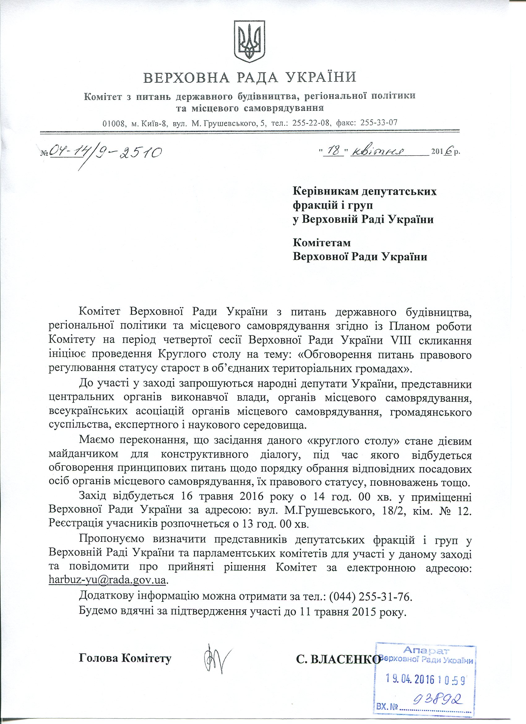 Вхідна документація > Лист Комітету ВРУ з питань державного будівництва, регіональної політики та місцевого самоврядування щодо проведення круглого столу на тему: “Обговорення питань правового регулювання статусу старост в об’єднаних територіальних громадах”