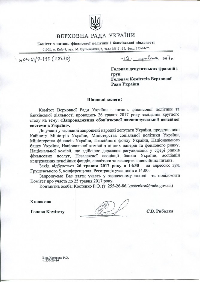 Лист Комітету ВРУ з питань фінансової політики і банківської діяльності про проведення круглого столу на тему: “Запровадження обов’язкової накопичувальної пенсійної системи в Україні”