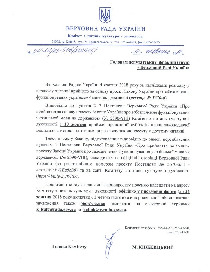 17Жов Коментування вимкнено Лист Комітету ВРУ з питань культури і духовності щодо подання пропозицій до проекту Закону України “Про забезпечення функціонування української мови як державної”, реєстр. №5670-д