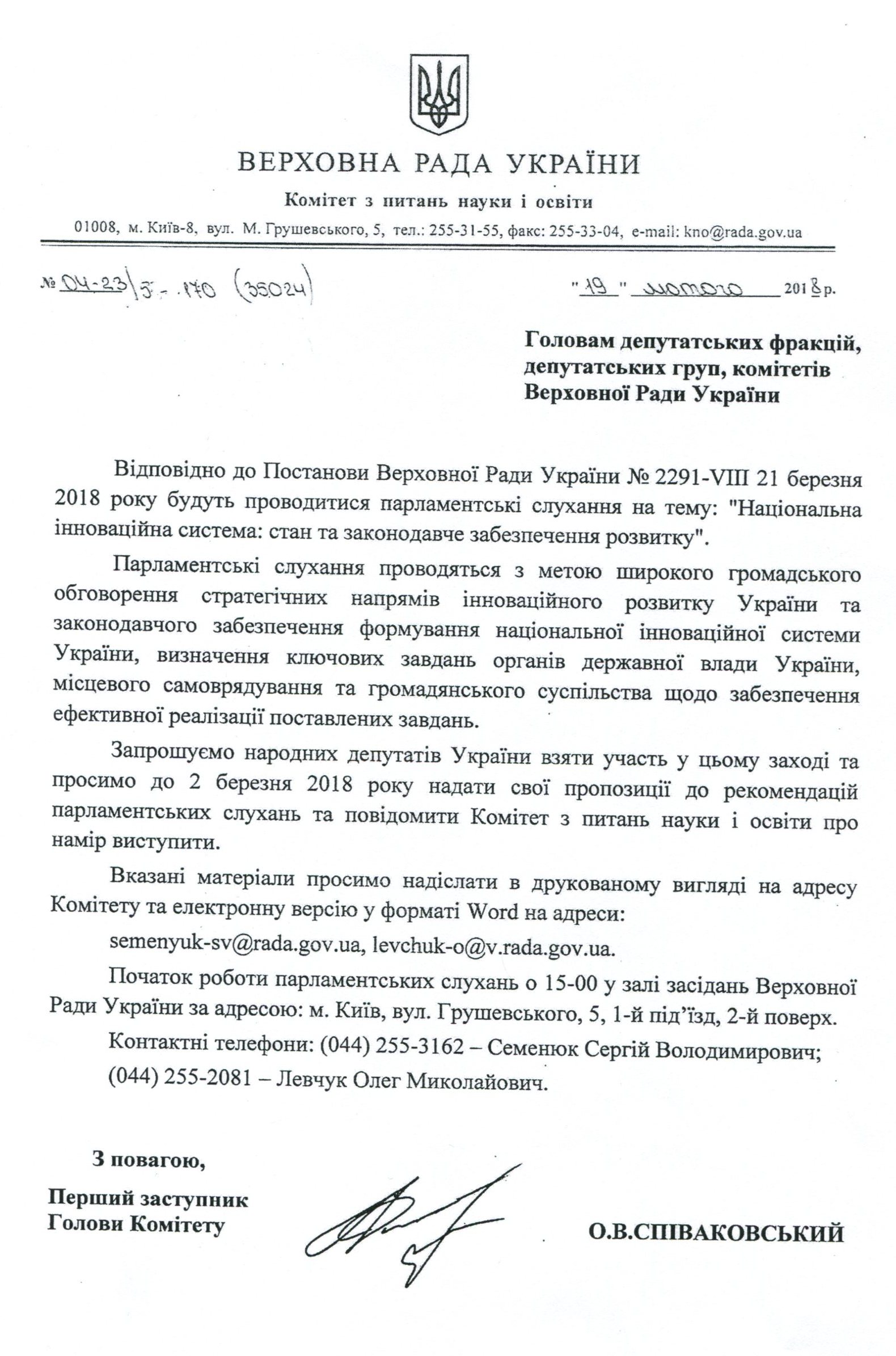 Лист Комітету ВРУ з питань науки і освіти про проведення парламентських слухань на тему: “Національна інноваційна система: стан та законодавче забезпечення розвитку”, 21 березня 2018 року