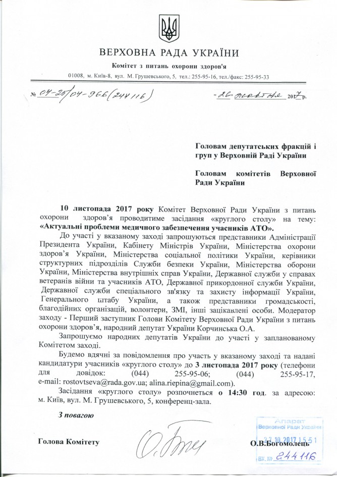 06Лис Коментування вимкнено Лист Комітету ВРУ з питань охорони здоров’я про проведення круглого столу на тему: “Актуальні проблеми медичного забезпечення учасників АТО”, 10 листопада 2017 року
