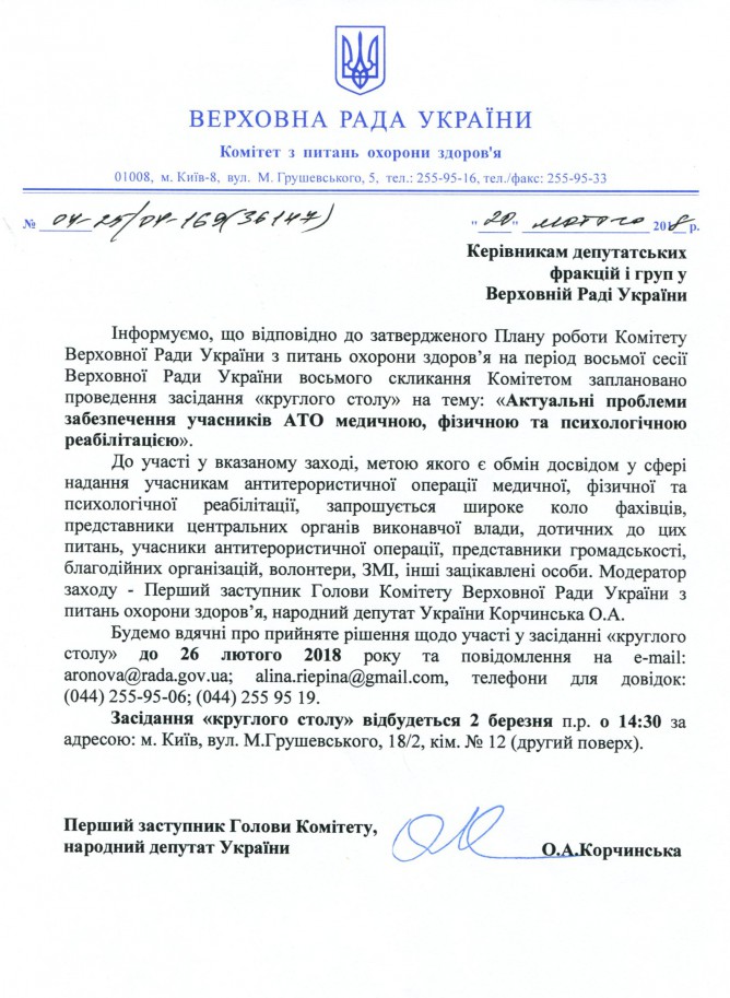 Вхідна документація > Лист Комітету ВРУ з питань охорони здоров’я про проведення круглого столу на тему: “Актуальні проблеми забезпечення учасників АТО медичною, фізичною та психологічною реабілітацією”, 2 березня 2018 року