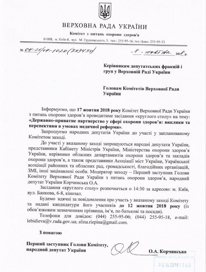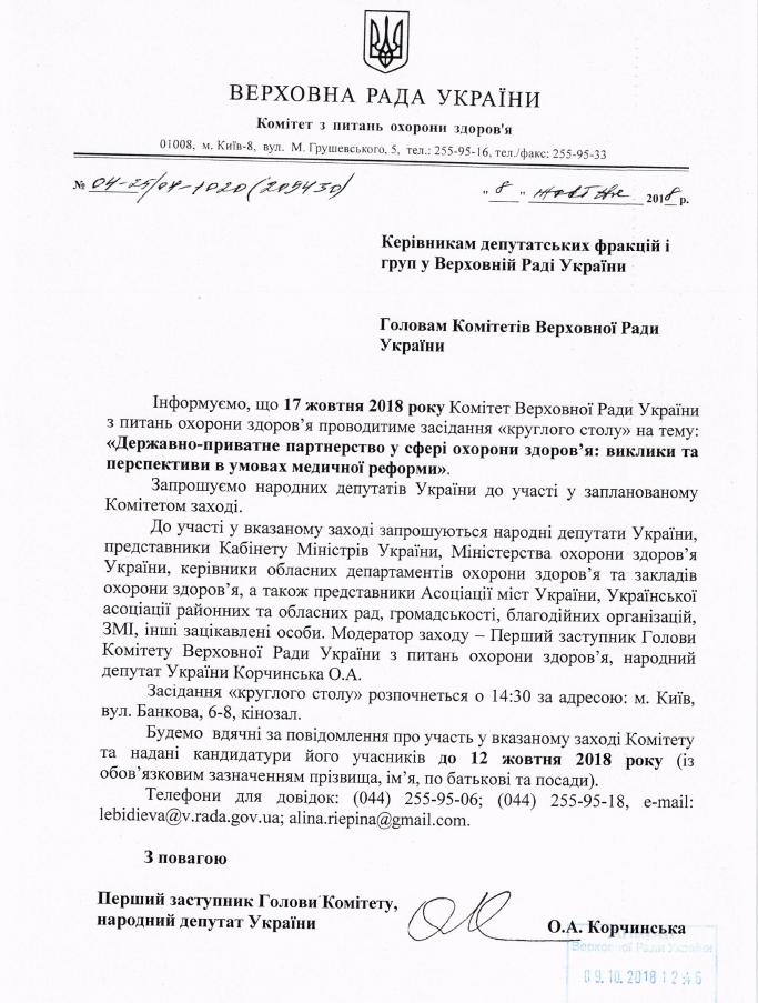 Вхідна документація > Лист Комітету ВРУ з питань охорони здоров’я про проведення круглого столу на тему: “Державно-приватне партнерство у сфері охорони здоров’я: виклики та перспективи в умовах медичної реформи”, 17.10.2018 року