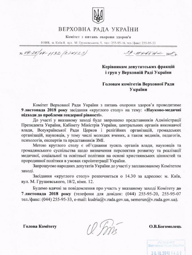 31Жов Коментування вимкнено Лист Комітету ВРУ з питань охорони здоров’я про проведення круглого столу на тему: “Науково-медичні підходи до проблеми гендерної рівності”, 9 листопада 2018 року