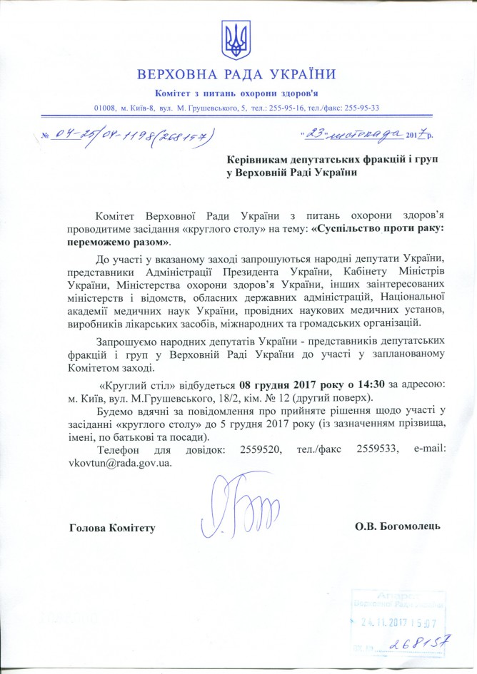 28Лис Коментування вимкнено Лист Комітету ВРУ з питань охорони здоров’я про проведення круглого столу на тему: “Суспільство проти раку: переможемо разом”, 8 грудня 2017 року