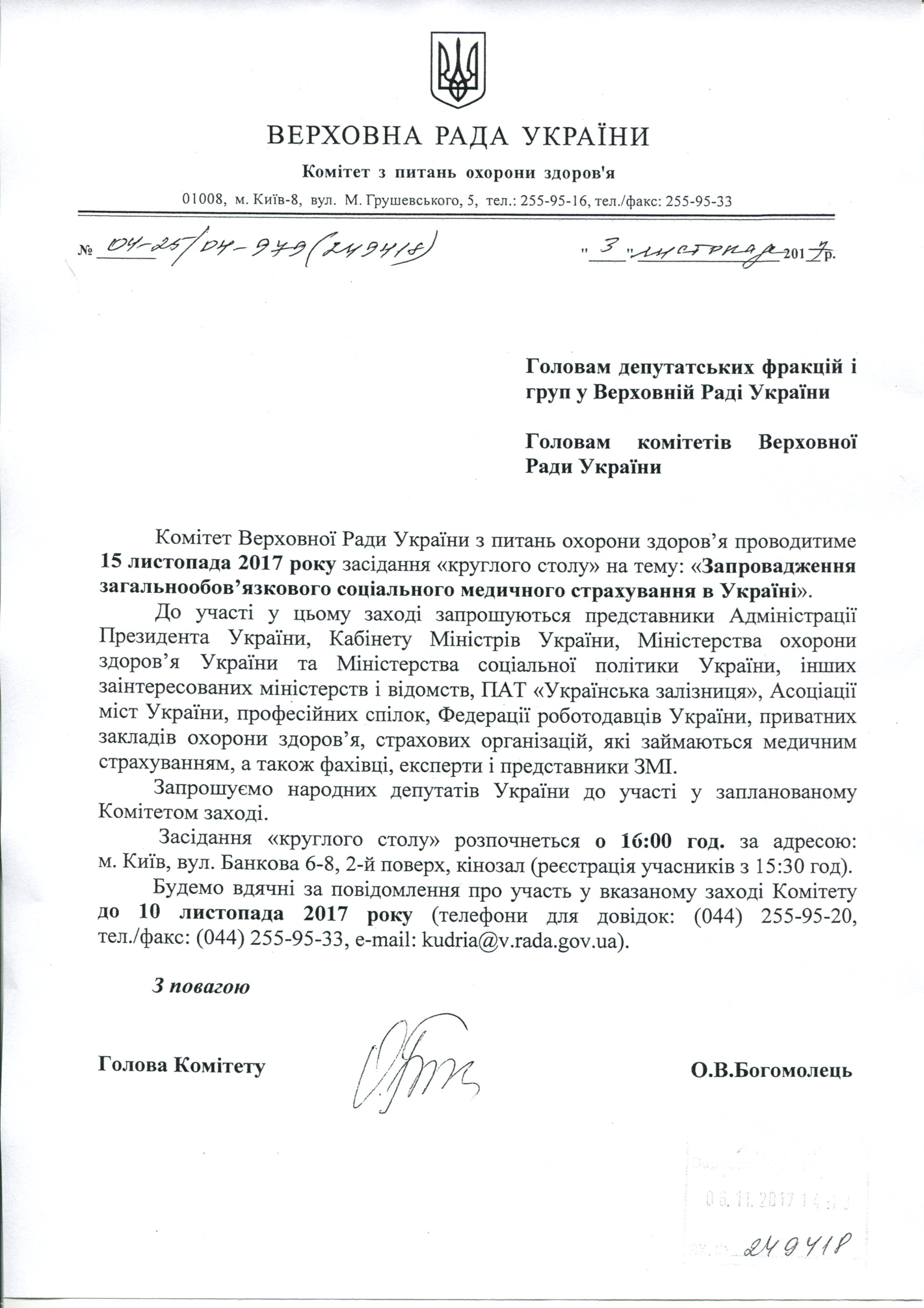 09Лис Коментування вимкнено Лист Комітету ВРУ з питань охорони здоров’я про проведення круглого столу на тему: “Запровадження загальнообов’язковогосоціального медичного страхування в Україні”, 15 листопада 2017 року