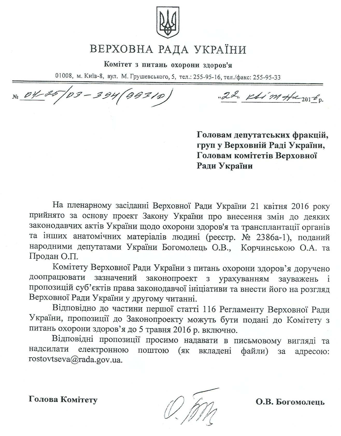 Лист Комітету ВРУ з питань охорони здоров’я щодо подання поправок до проекту Закону України “Про внесення змін до деяких законодавчих актів України щодо охорони здоров’я та трансплантації органів та інших анатомічних матеріалів людині”, реєстр. №2386а-1