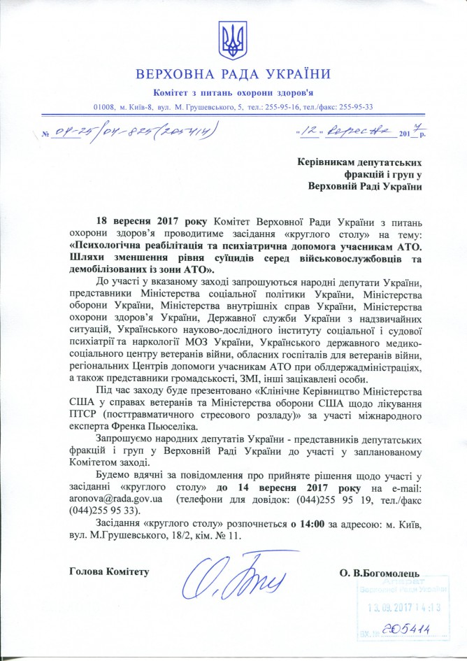 Вхідна документація > Лист Комітету ВРУ з питань охорони здоров’я щодо проведення круглого столу на тему: “Психологічна реабілітація та психіатрична допомога учасникам АТО. Шляхи зменшення рівня суїцидів серед військовослужбовців та демобілізованих із зони АТО”, 18 вересня 2017 року