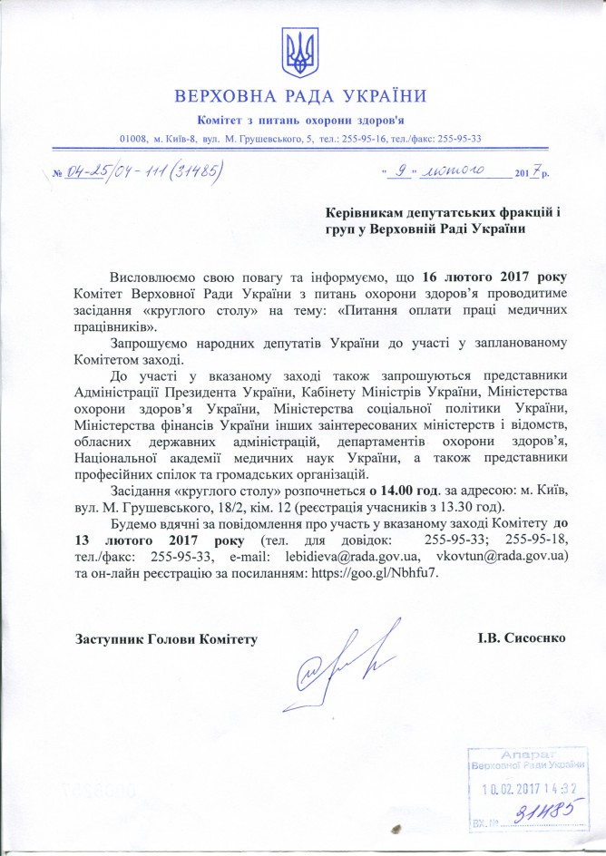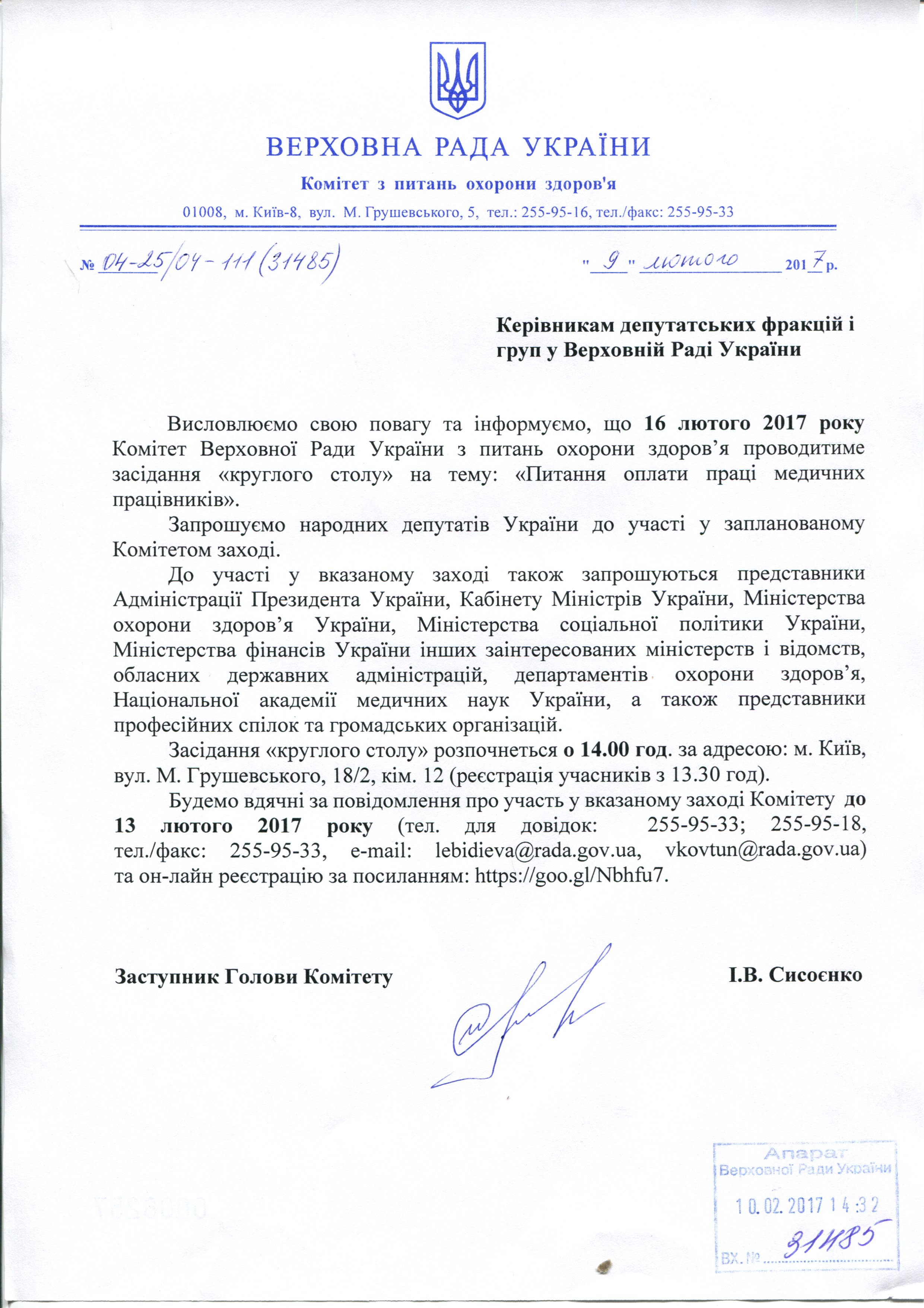 13Лют Коментування вимкнено Лист Комітету ВРУ з питань охорони здоров’я щодо проведення круглого столу на тему: “Питання оплати праці медичних працівників”
