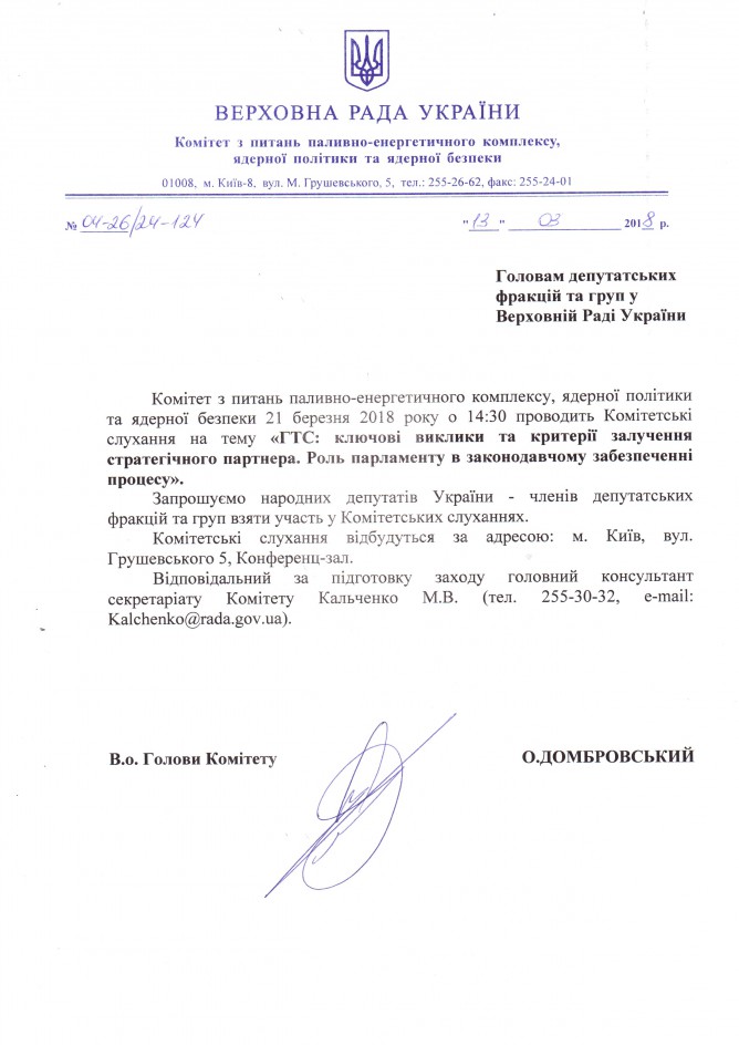 Вхідна документація > Лист Комітету ВРУ з питань паливно-енергетичного комплексу, ядерної політики та ядерної безпеки щодо проведення комітетських слухань на тему: “ГТС: ключові виклики та критерії залучення стратегічного партнера. Роль парламенту в законодавчому забезпеченні процесу”, 21 березня 2018 року