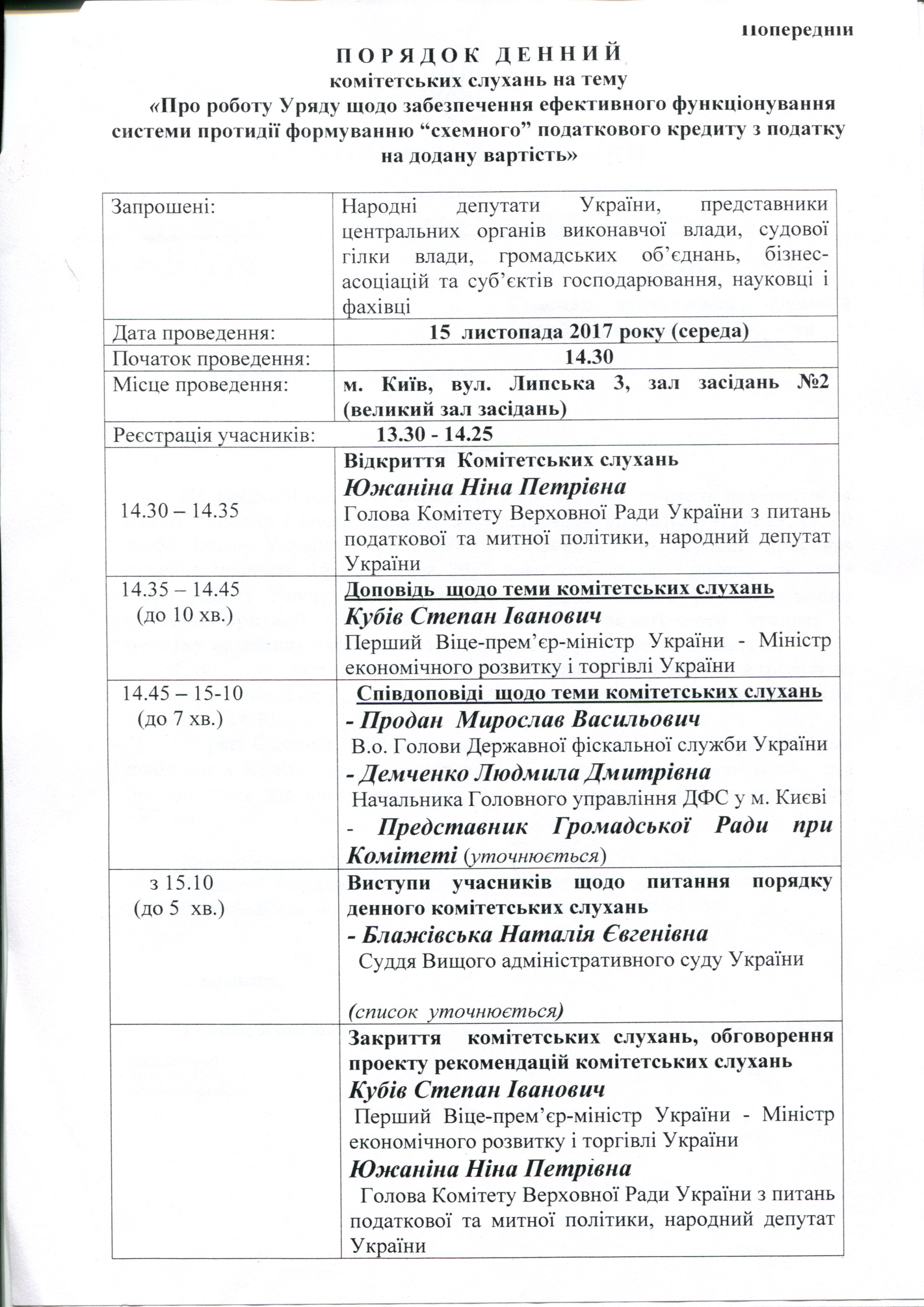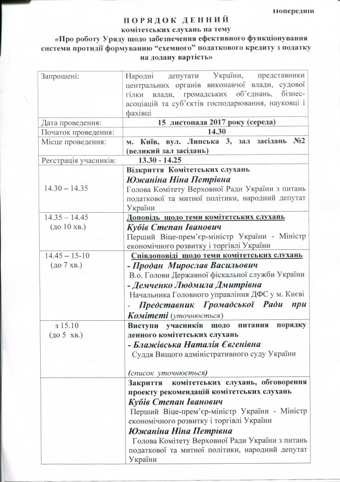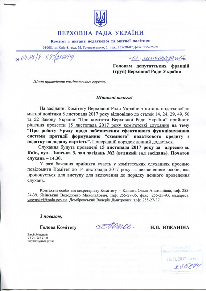 Вхідна документація > Лист Комітету ВРУ з питань податкової та митної політики про проведення комітетських слухань на тему: “Про роботу Уряду щодо забезпечення ефективного функціонування системи протидії формуванню “схемного” податкового кредиту з податку не додану вартість”, 15.11.2017 року