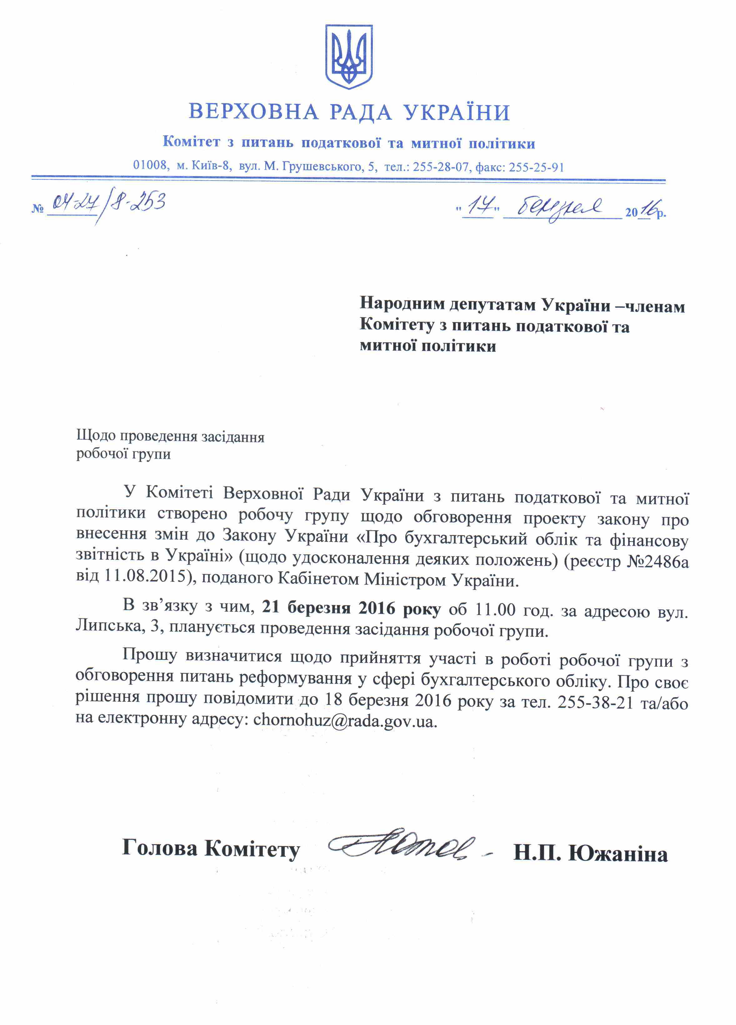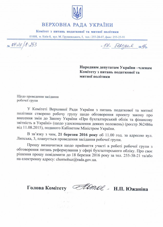 Вхідна документація > Лист Комітету ВРУ з питань податкової та митної політики щодо створення робочої групи з обговорення законопроекту “Про внесення змін до Закону України “Про бухгалтерський облік та фінансову звітність в Україні”, реєстр. №2486а
