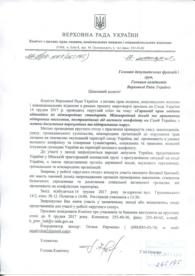 Вхідна документація > Лист Комітету ВРУ з питань прав людини, національних меншин і міжнаціональних відносин щодо проведення круглого столу на тему “Гарантії прав людини відповідно до міжнародних стандартів. Міжнародний досвід та практична підтримка населення, постраждалих від воєнного конфлікту на Сході України, з метою досягнення порозуміння та підтримання миру”, 14.12.2017 року