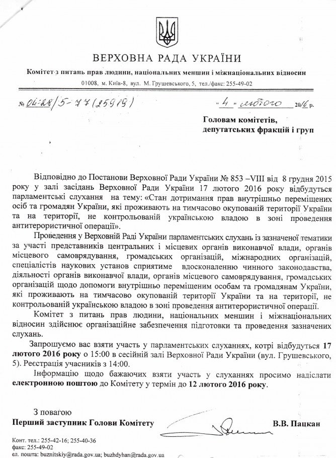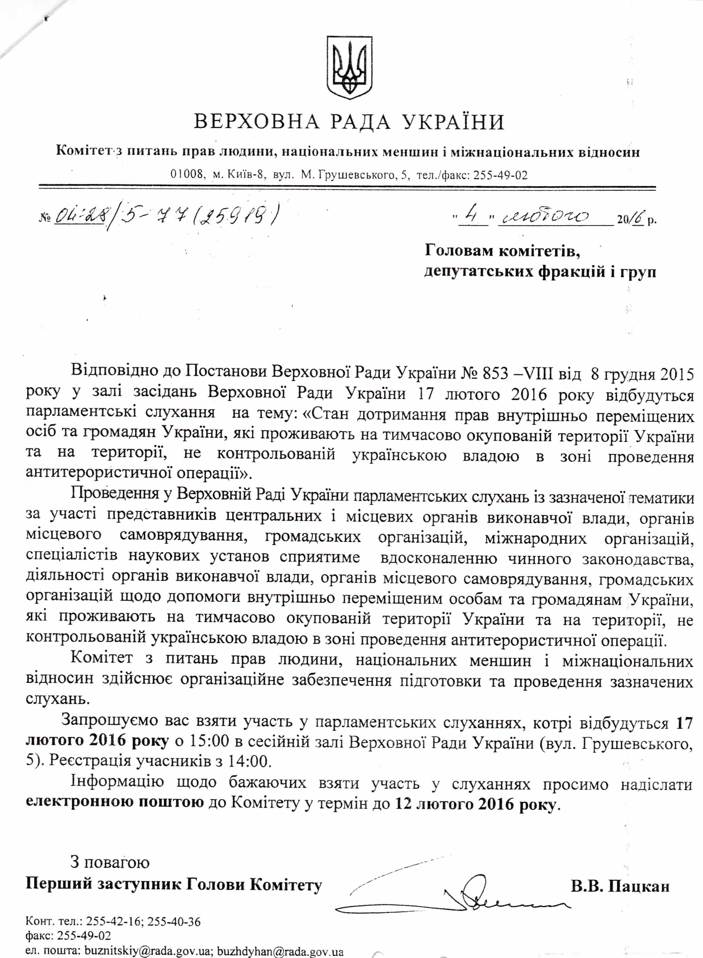 Вхідна документація > Лист Комітету ВРУ з питань прав людини, національних меншин і міжнаціональних відносин щодо проведення парламентських слухань на тему “Стан дотримання прав внутрішньо переміщених осіб та громадян України, які проживають на тимчасово окупованій території України”
