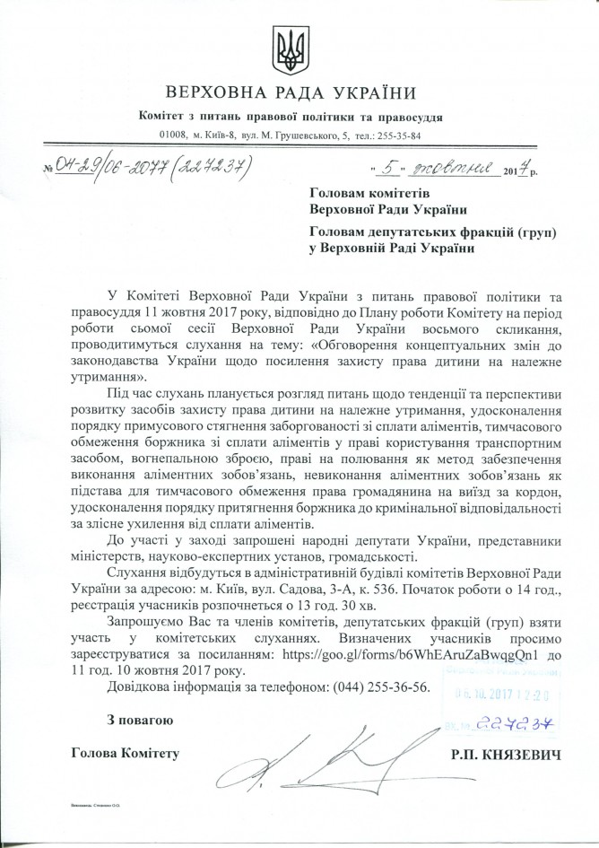 Вхідна документація > Лист Комітету ВРУ з питань правової політики та правосуддя щодо проведення комітетських слухань на тему: “Обговорення концептуальних змін до законодавства України щодо посилення захисту права дитини на належне утримання”, 11 жовтня 2017 року
