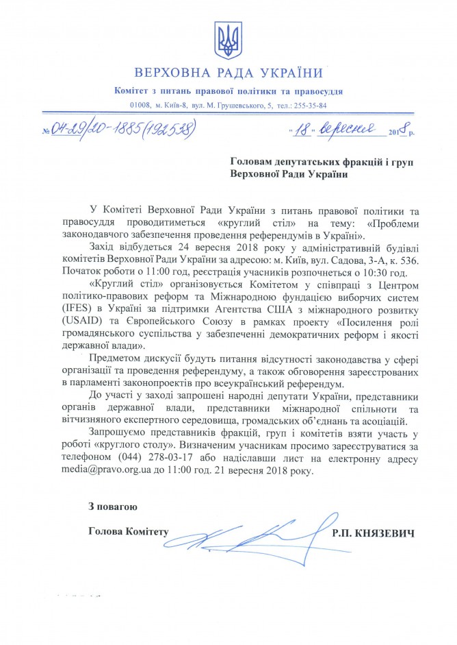 19Вер Коментування вимкнено Лист Комітету ВРУ з питань правової політики та правосуддя щодо проведення круглого столу на тему: “Проблеми законодавчого забезпечення проведення референдумів в Україні”, 24 вересня 2018 року