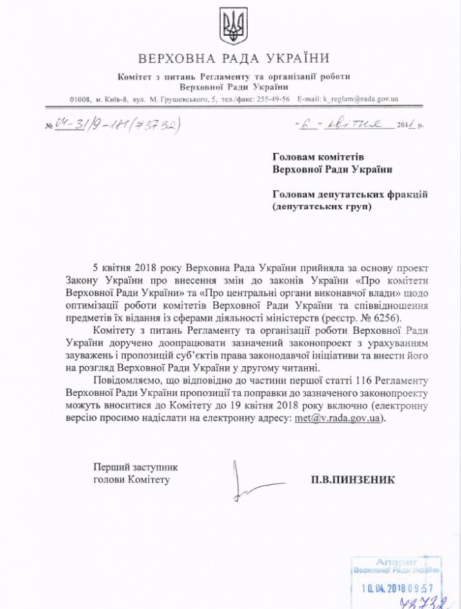 Лист Комітету ВРУ з питань Регламенту та організації роботи Верховної Ради України щодо подання поправок до законопроекту «Про внесення змін до законів України «Про комітети Верховної Ради України» та «Про центральні органи виконавчої влади» щодо оптимізації роботи комітетів Верховної Ради України та співвідношення предметів їх відання із сферами діяльності міністерств», реєстр. №6256