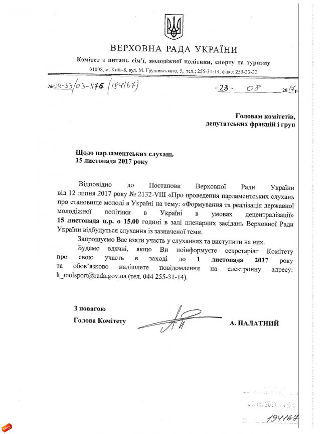 Вхідна документація > Лист Комітету ВРУ з питань сім’ї, молодіжної політики, спорту та туризму щодо парламентських слухань на тему “Формування та реалізація державної молодіжної політики в Україні в умовах децентралізації”, які відбудуться 15.11.2017 року