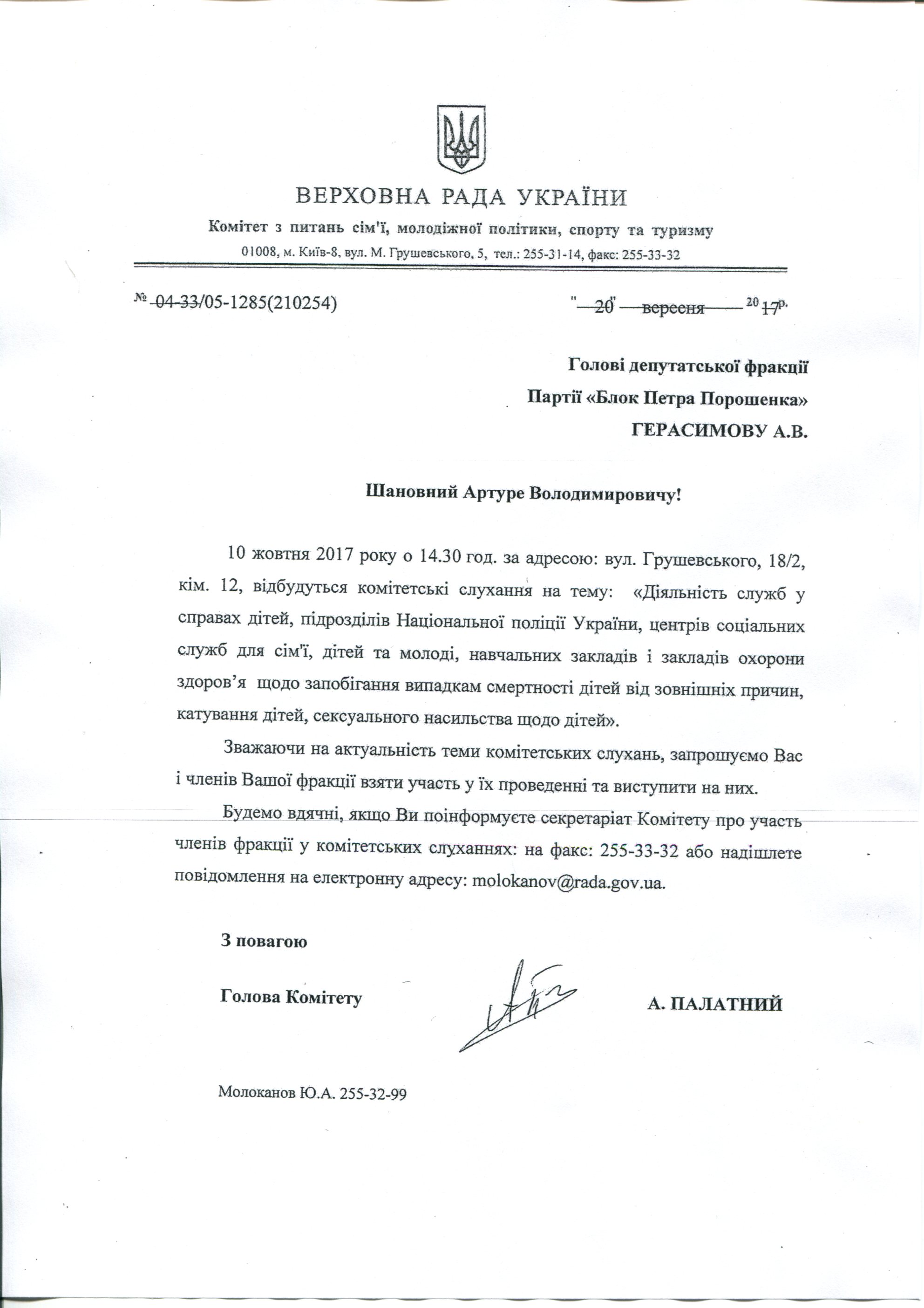 Вхідна документація > Лист Комітету ВРУ з питань сім’ї, молодіжної політики, спорту та туризму щодо проведення комітетських слухань на тему: “Діяльність служб у справах дітей, підрозділів Національної поліції України, центрів соціальних служб для сім’ї, дітей та молоді, навчальних закладів і закладів охорони здоров’я щодо запобігання випадкам смертності дітей від зовнішніх причин, катування дітей, сексуального насильства щодо дітей” 10 жовтня 2017 року