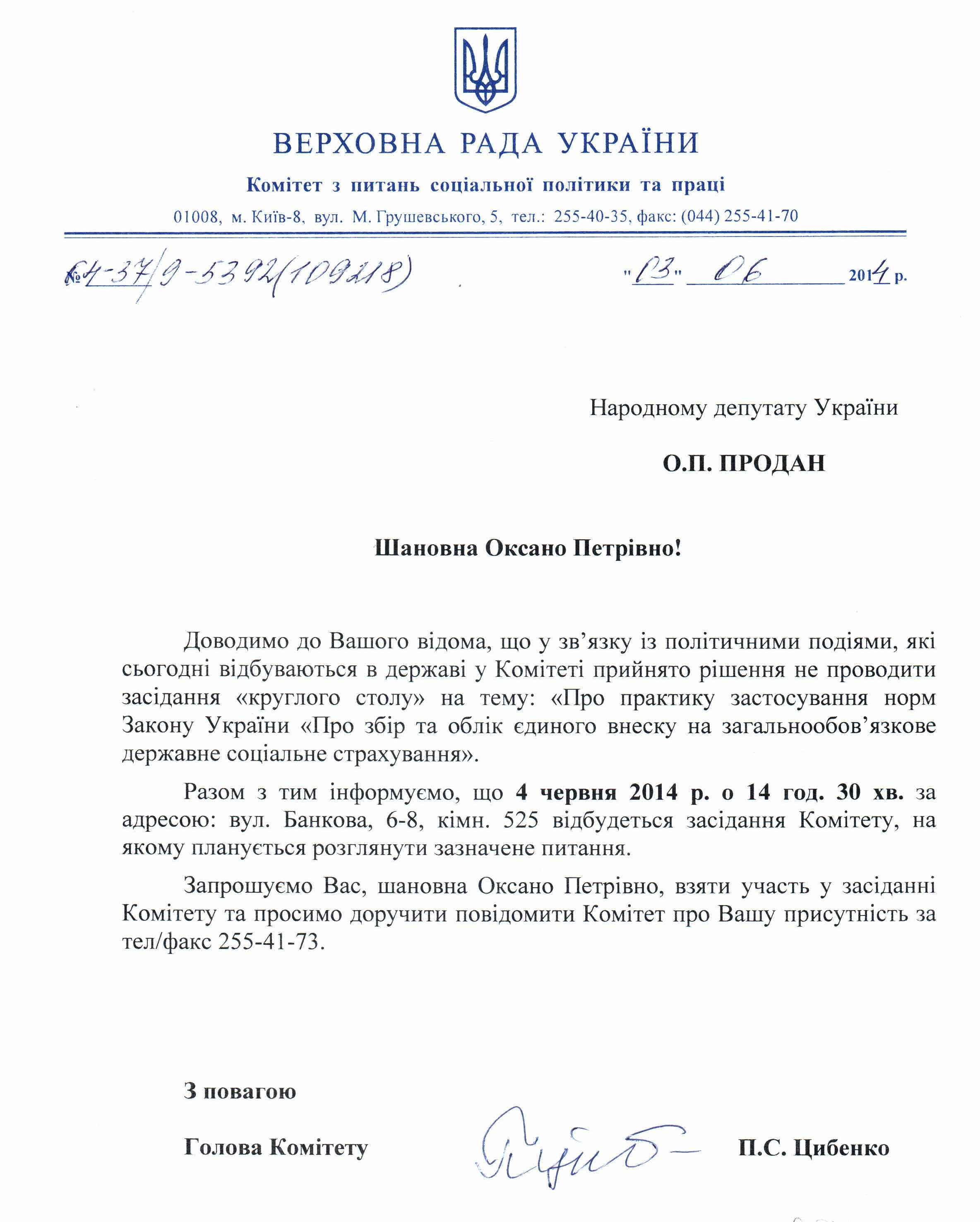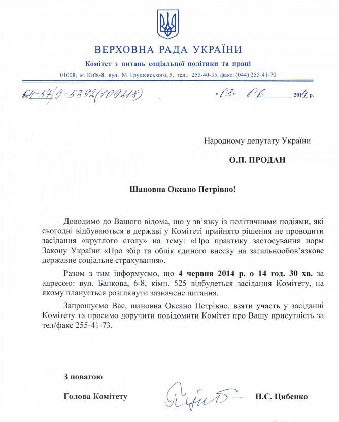 Лист Комітету ВРУ з питань соціальної політики та праці щодо проведення засідання Комітету та відміни круглого столу “Про практику застосування норм Закону України “Про збір та облік єдиного внеску на загальнообов’язкове державне соціальне страхування”"
