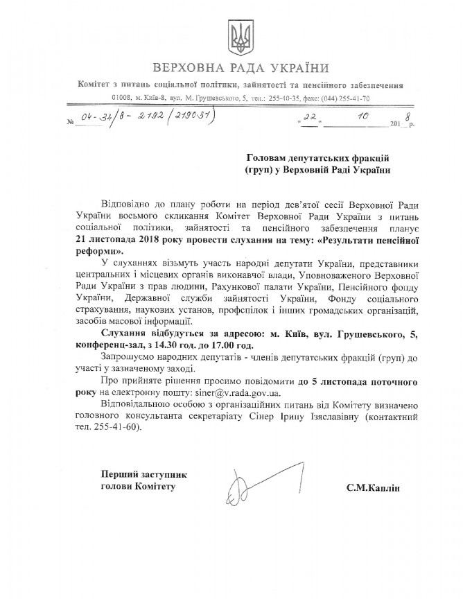 24Жов Коментування вимкнено Лист Комітету ВРУ з питань соціальної політики, зайнятості та пенсійного забезпечення щодо проведення комітетських слухань на тему: “Результати пенсійної реформи”, 21 листопада 2018 року
