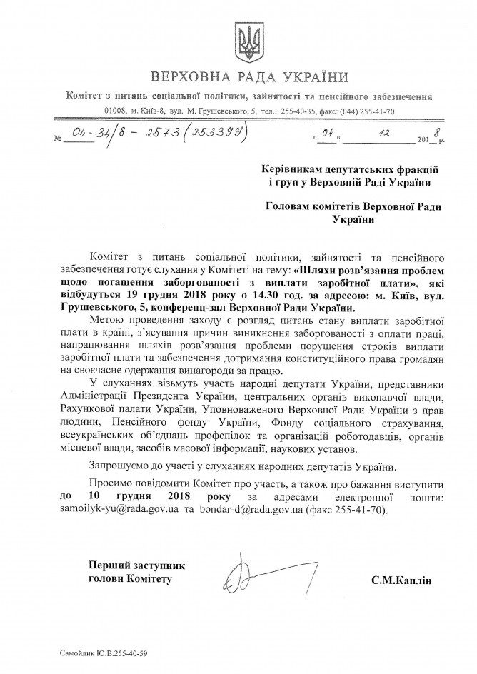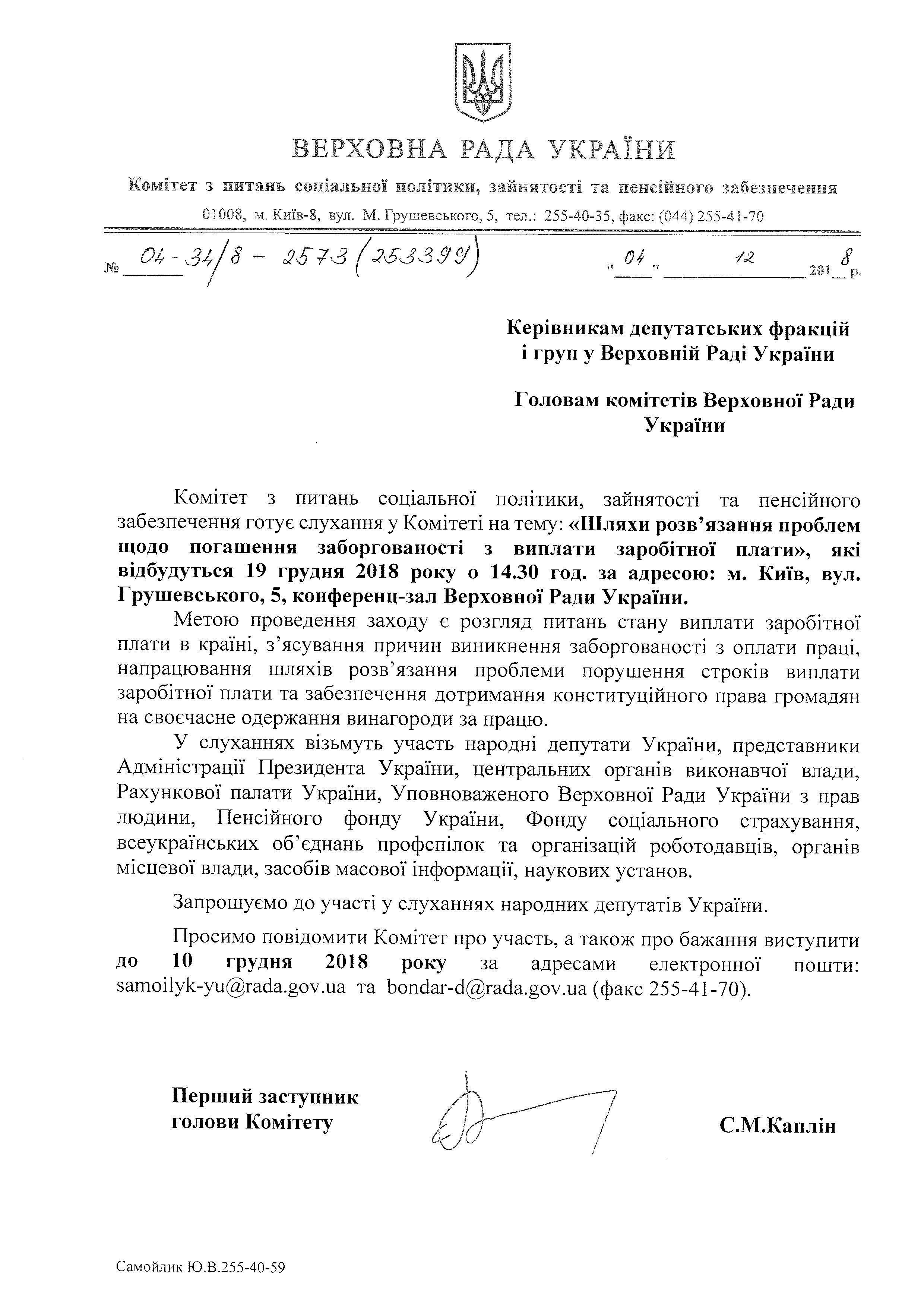 Вхідна документація > Лист Комітету ВРУ з питань соціальної політики, зайнятості та пенсійного забезпечення щодо проведення комітетських слухань на тему: “Шляхи розв’язання проблем щодо погашення заборгованості з виплати заробітної плати”, 19 грудня 2018 року