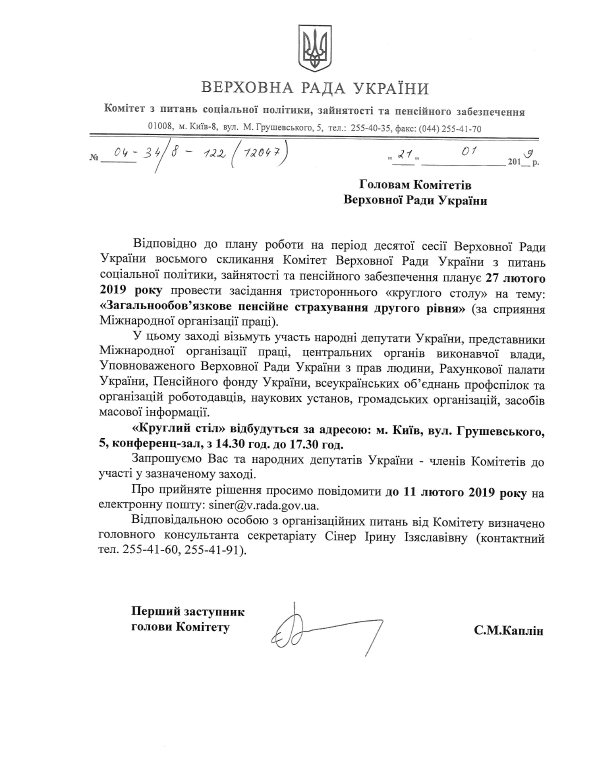 24Січ Коментування вимкнено Лист Комітету ВРУ з питань соціальної політики, зайнятості та пенсійного забезпечення щодо проведення круглого столу на тему: “Загальнообов’язкове пенсійне страхування другого рівня”