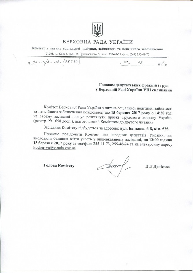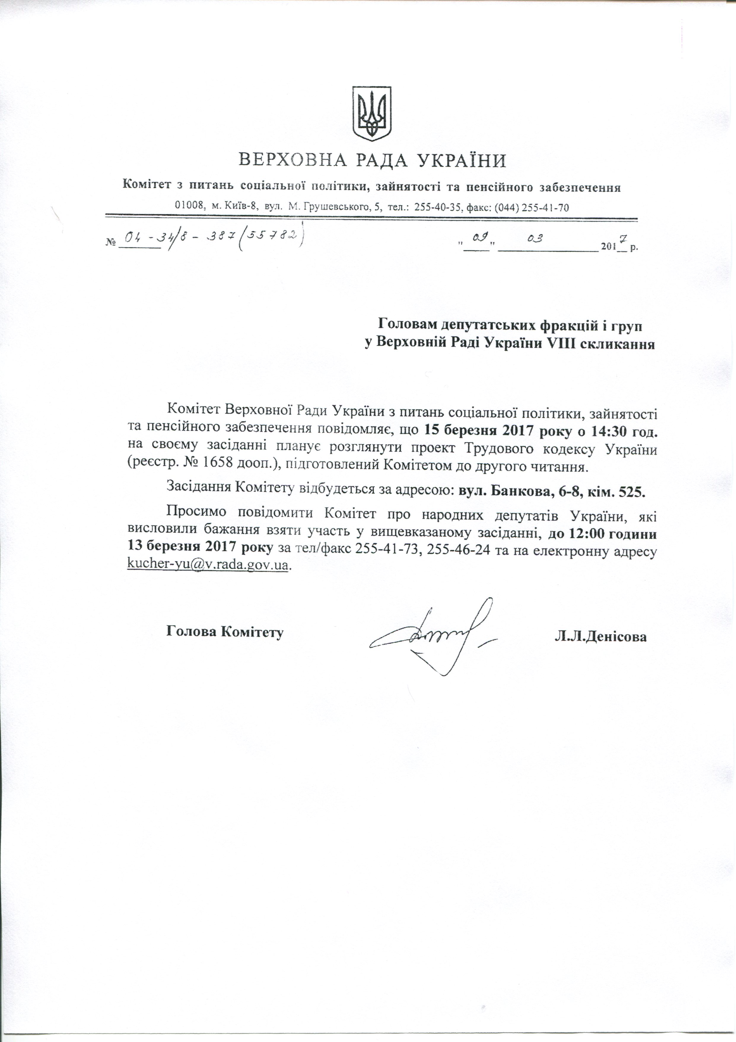 Вхідна документація > Лист Комітету ВРУ з питань соціальної політики, зайнятості та пенсійного забезпечення щодо розгляду на засіданні Комітету підготовленого до другого читання проекту Трудового кодексу України, реєстр. №1658