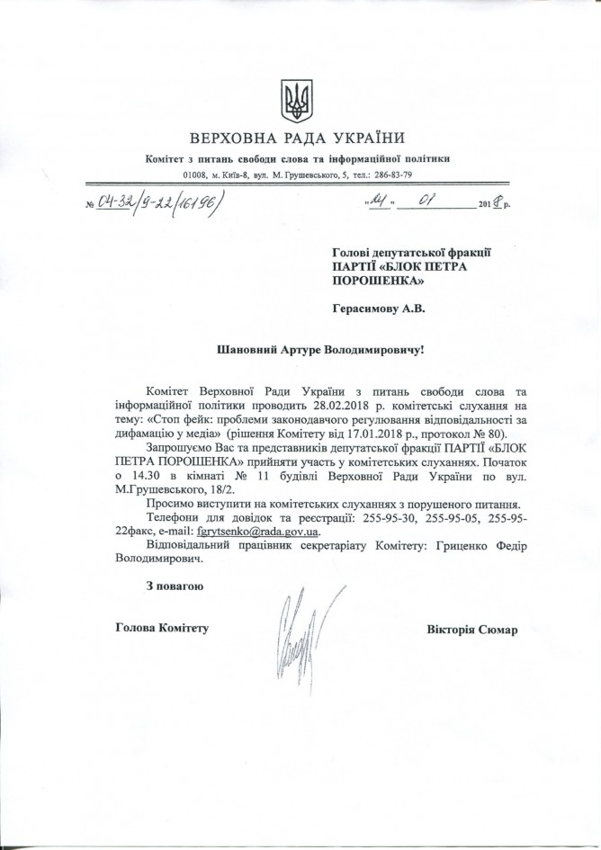 Лист Комітету ВРУ з питань свободи слова та інформаційної політики про проведення комітетських слухань на тему: “Стоп фейк: проблеми законодавчого регулювання відповідальності за дифамацію у медіа”, 28 лютого 2018 року