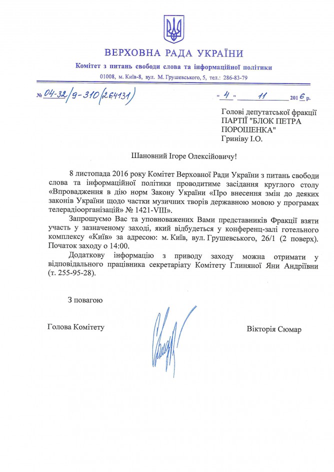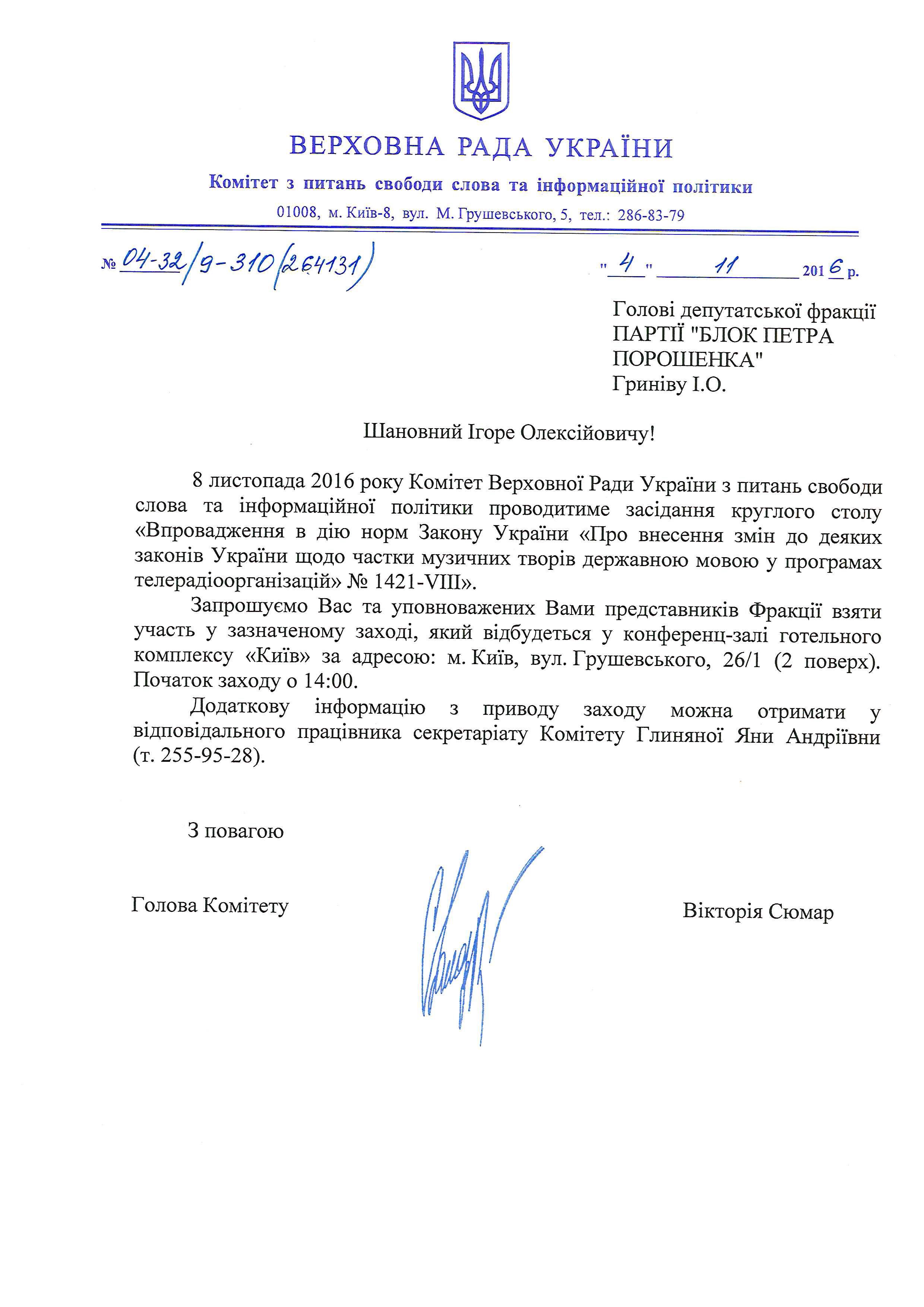 Головна > Верховна Рада України > Вхідна документація > Лист Комітету ВРУ з питань свободи слова та інформаційної політики щодо проведення круглого столу “Впровадження в дію норм Закону України “Про внесення змін до деяких законів України щодо частки музичних творів державною мовою у програмах телерадіоорганізацій”