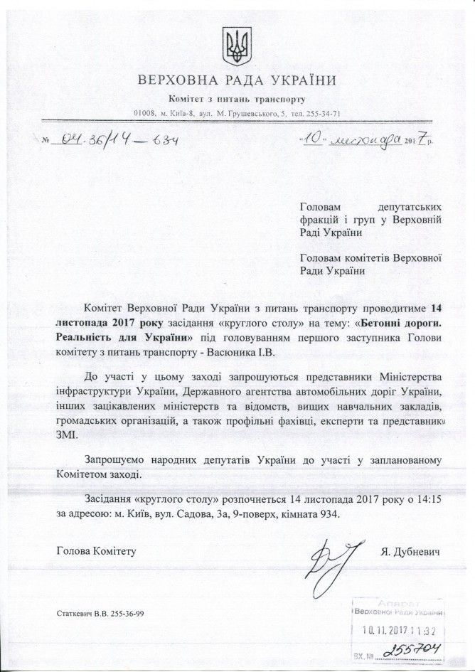 Лист Комітету ВРУ з питань транспорту про проведення круглого столу на тему: “Бетонні дороги. Реальність для України”, 14.11.2017 року