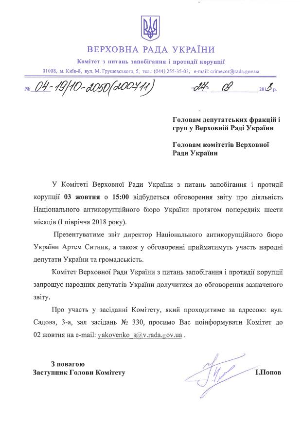 Вхідна документація > Лист Комітету ВРУ з питань запобігання і протидії корупції про проведення обговорення звіту про діяльність Національного антикорупційного бюро України протягом шести місяців (І півріччя 2018 року), 3 жовтня 2018 року