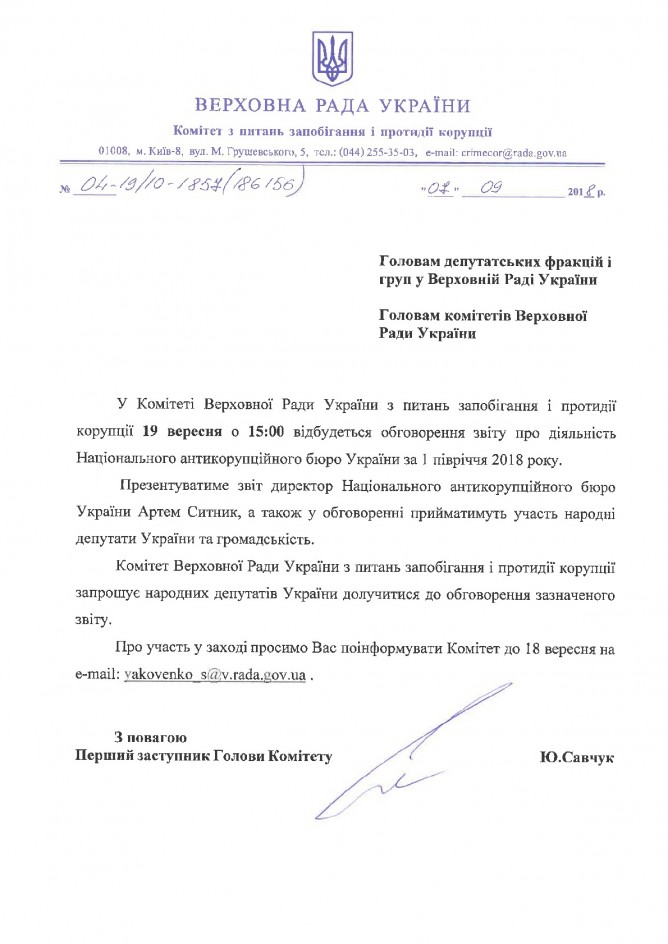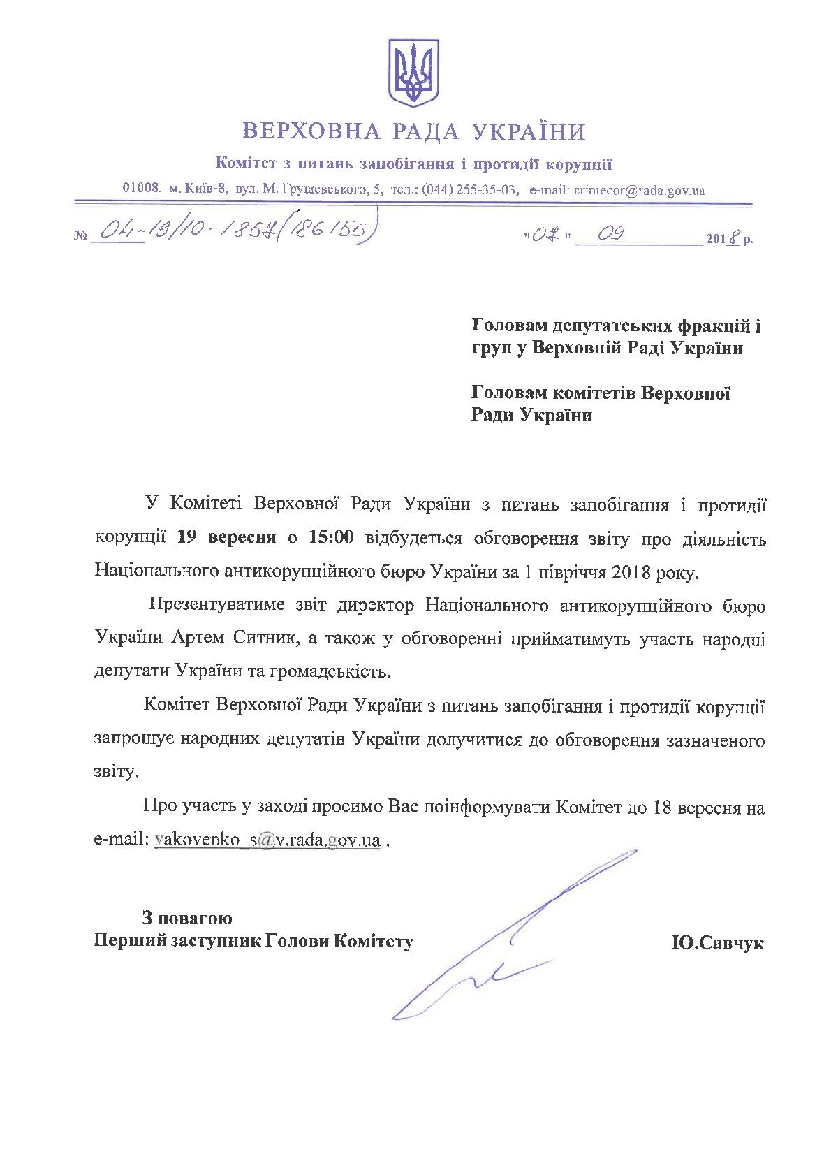 14Вер Коментування вимкнено Лист Комітету ВРУ з питань запобігання і протидії корупції щодо обговорення звіту про діяльність Національного антикорупціного бюро України за 1 півріччя 2018 року, 19 вересня 2018 року