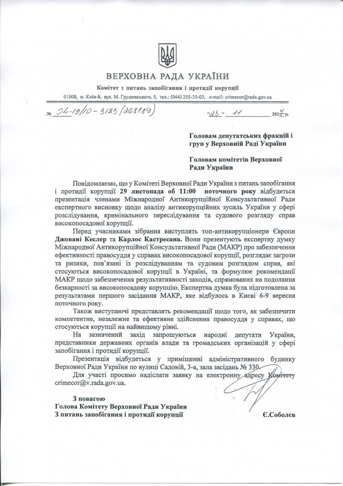 Вхідна документація > Лист Комітету ВРУ з питань запобігання і протидії корупції щодо презентації експертного висновку щодо аналізу антикорупційних зусиль України у сфері розслідування, кримінального переслідування та судового розгляду справ високопосадової корупції, 29.11.2017 року