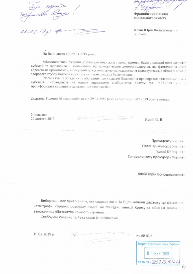 Лист Козія Ю.В. щодо відмови йому у житловій субсидії