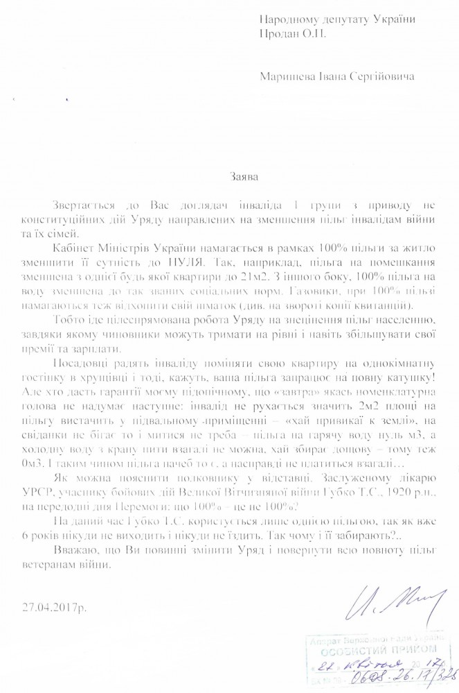 13Тра Коментування вимкнено Лист Маришева І.С. щодо неконституційності зменшення пільг інвалідам війни та їх сім’ям