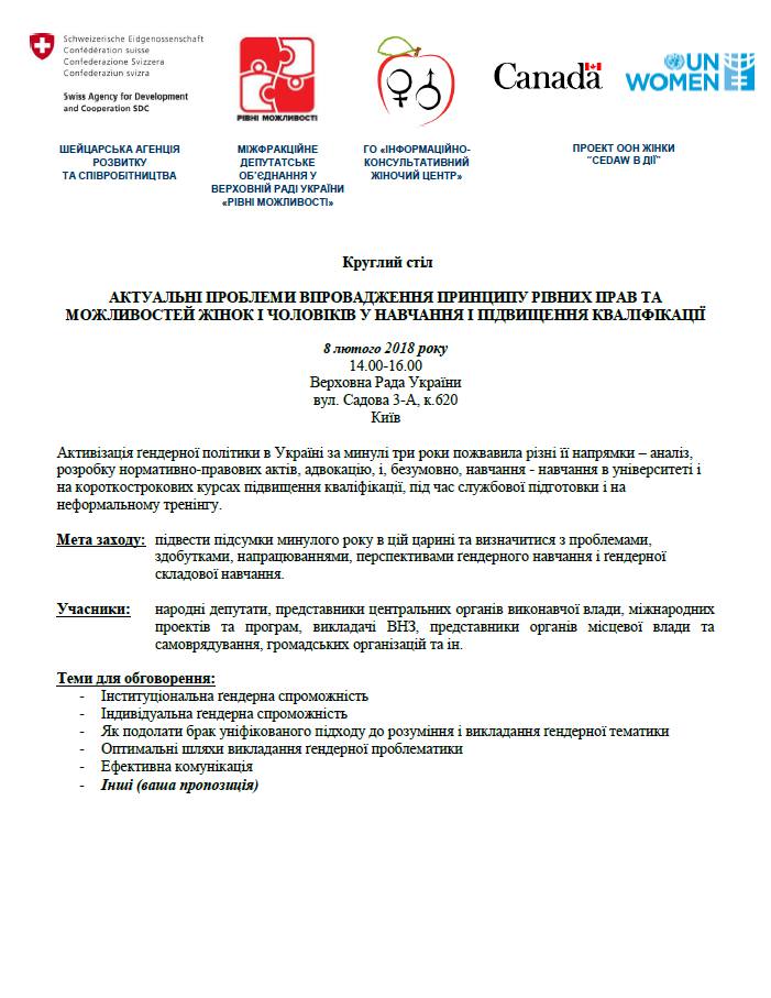 Запрошуємо Вас взяти участь у круглому столі 8 лютого о 14:00 (Садова, 3а, к.620) на тему ”Актуальні проблеми впровадження принципу рівних прав та можливостей жінок і чоловіків у навчання і підвищення кваліфікації“, який проводять ГО “Інформаційно-консультативний жіночий центр”у співпраці з Міжфракційним об’єднанням “Рівні можливості”, ООН Жінки в Україні, та за підтримки Швейцарської агенції розвитку та співробітництва.