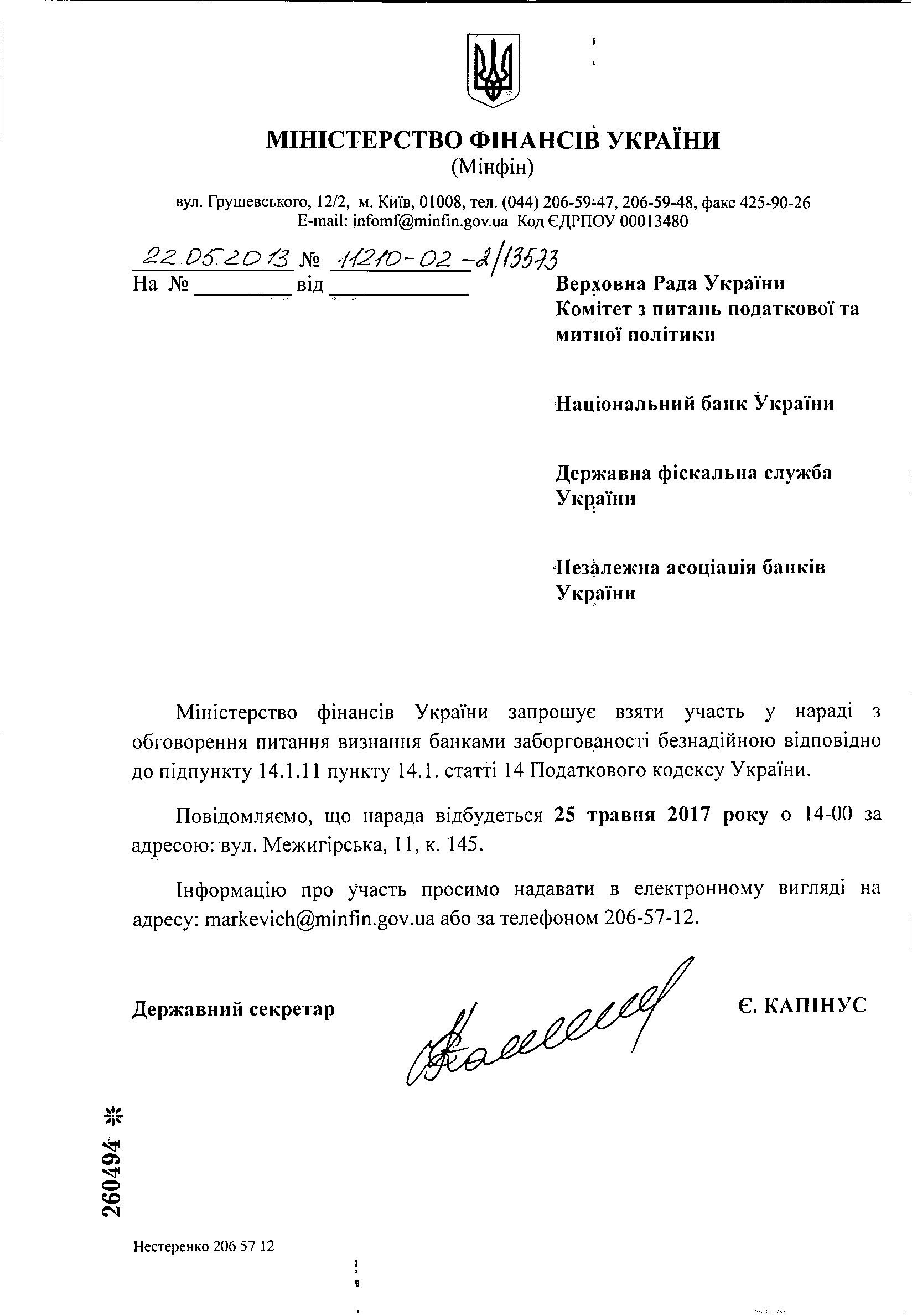 Лист Міністерства фінансів України про проведення 25.05.2017 р. наради з обговорення питання визнання банками заборгованості безнадійною