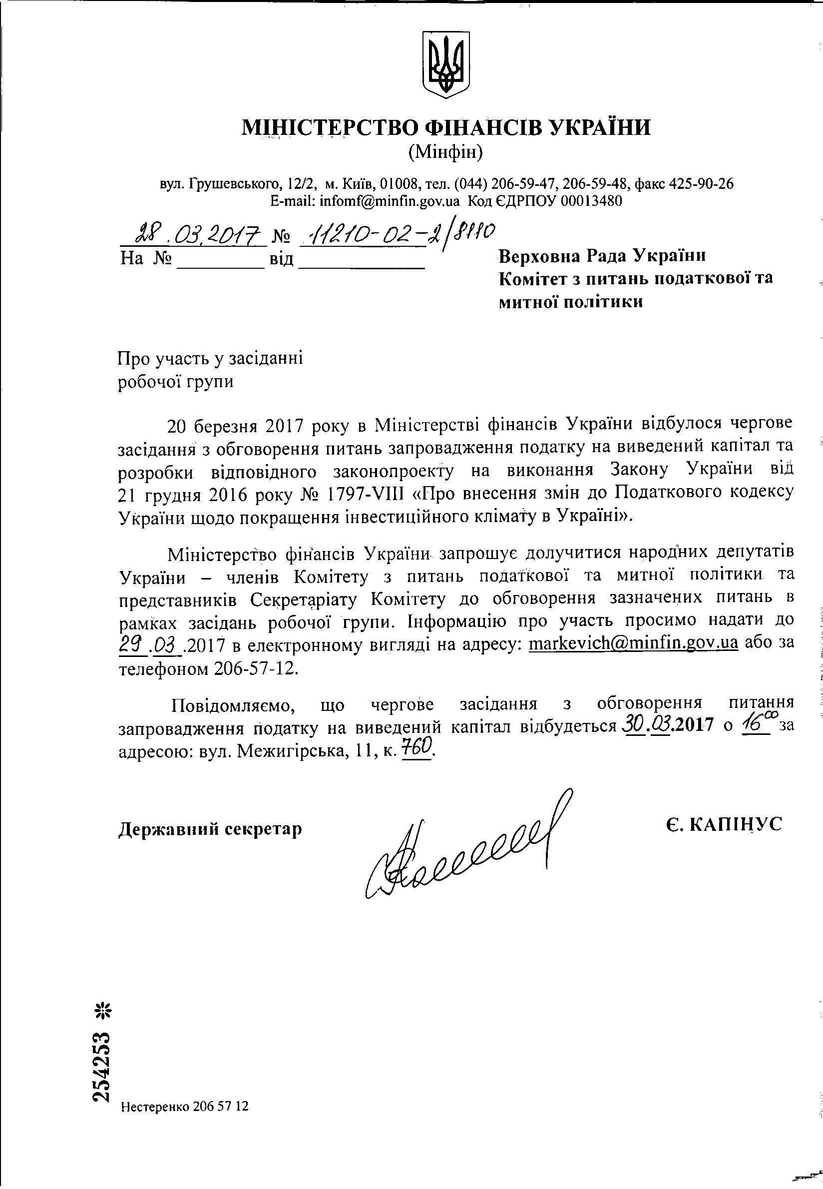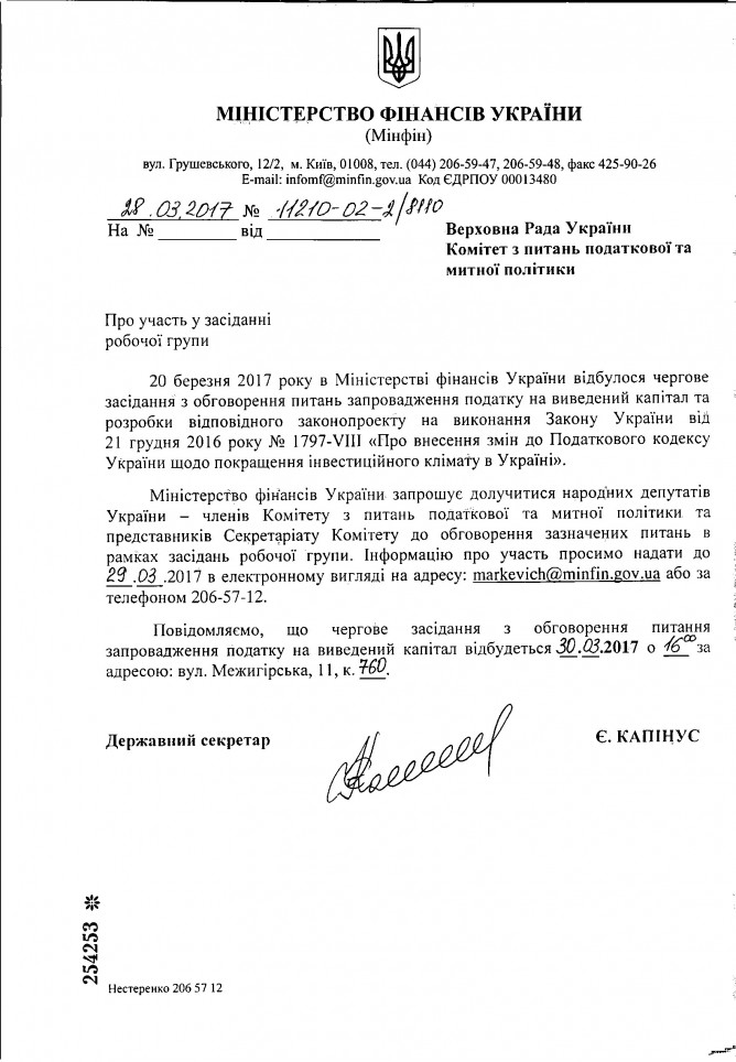 Лист Міністерства фінансів України про засідання з обговорення питання запровадження податку на виведений капітал